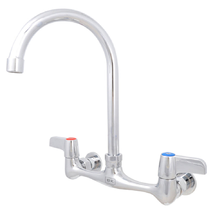 The BK Resources BKF-8W-8G-G WorkForce™ Standard Duty Faucet is a splash-mounted fixture designed specifically for environments requiring reliable plumbing solutions. This faucet features an 8-inch on-center (OC) installation setup and is equipped with an 8-inch gooseneck spout, allowing for optimal water flow and reach. Its construction includes a double O-ring spout seal, ensuring a secure and leak-resistant performance. This faucet utilizes 1/4 turn ceramic cartridges, known for their durability and smooth operational efficiency. The inclusion of stainless steel valves contributes to its robust design, enhancing its longevity and resilience in demanding settings. The polished chrome finish not only adds a sleek aesthetic but also provides a protective layer against corrosion. Importantly, the BKF-8W-8G-G is lead-free, aligning with health safety standards and ensuring safe water delivery. It holds both NSF and cCSAus certifications, signifying its adherence to stringent quality and safety regulations. This faucet is a suitable choice for commercial kitchens, healthcare facilities, or any industry where reliable water supply equipment is essential, offering a blend of functionality, safety, and compliance with industry standards.