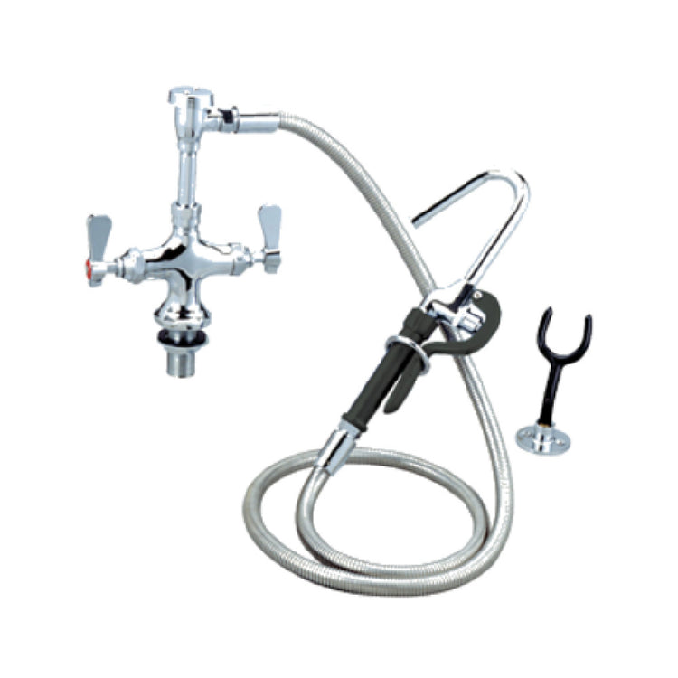 The BK Resources BKF-DDMPF-G OptiFlow™ Pot Filler Deck Mount Single Hole Center is engineered for culinary settings that demand efficiency and precision. This pot filler is defined by its single-hole deck mount design, integrating seamlessly into kitchen environments where space and functionality are paramount. Its standout feature is the 72-inch stainless steel braided hose, which provides exceptional reach and flexibility, catering to a variety of culinary applications. The inclusion of a wall hook ensures convenient, space-saving storage when the pot filler is not in use. Additionally, the unit is equipped with hot and cold mixing hoses, allowing for versatile temperature control directly at the source. The high-polished nickel chrome finish not only enhances the aesthetic appeal but also contributes to durability and ease of cleaning. Importantly, this pot filler is lead-free, underscoring its commitment to safety and health standards. Specifically designed for kitchens, restaurants, and catering services, the BK Resources BKF-DDMPF-G OptiFlow™ Pot Filler is an asset for any culinary professional striving for enhanced productivity and streamlined operations. Its technical specifications reflect a blend of practicality and innovation, making it a suitable choice for diverse market segments within the food industry.