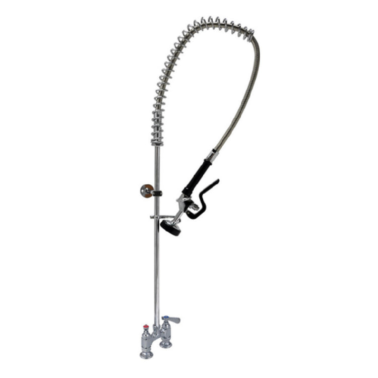 The BK Resources BKF-LF-4HDDPR-WB-G OptiFlow™ Pre-rinse Assembly is a technically advanced solution designed for versatile applications across various segments of the food service industry. Its deck mount configuration, with a 4-inch on-center (OC) installation, offers ease of integration into existing setups. The assembly includes a robust 44-inch stainless steel braided hose, featuring triple-ply construction capable of withstanding up to 300 psi, ensuring durability and reliability in demanding environments. A standout feature is its low flow spray head, specifically engineered to maintain water usage at less than 1 gallon per minute, making it an environmentally friendly choice without compromising performance. The assembly comes equipped with a 12-inch wall bracket for secure and stable mounting, while integral check valves and 1/4 turn ceramic valves contribute to efficient water flow management and ease of use. The 1/2-inch female inlets facilitate straightforward connection with plumbing systems. As a lead-free product, it aligns with health and safety standards, further underscored by its NSF and cCSAus certifications. This pre-rinse assembly is an ideal choice for those seeking a balanced combination of sustainability, efficiency, and high-performance in their kitchen operations.
