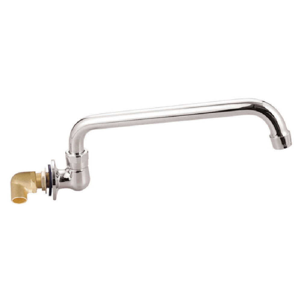 BK Resources BKF-WMB-16-G OptiFlow™ Heavy Duty Faucet Spout Splash Mount Base is an expertly engineered plumbing fixture designed for commercial environments. Featuring a splash mount base and a single hole center configuration, this faucet spout is built for precision and durability. The 16-inch swing spout allows for flexible water direction, catering to various workflow needs in kitchens or industrial settings. With a 1/2" NPS thread and a 90-degree elbow, it ensures a secure and efficient connection, minimizing potential leaks or water wastage. The chrome-plated finish not only enhances its aesthetic appeal but also provides a robust layer of protection against corrosion and wear. Its lead-free composition underscores its commitment to safety and environmental standards, as evidenced by its NSF certification. Additionally, the cCSAus certification highlights its compliance with Canadian and American standards, making it a reliable choice across North America. This versatile faucet spout is an ideal solution for businesses that prioritize both performance and adherence to stringent safety regulations, offering a seamless blend of functionality and design.