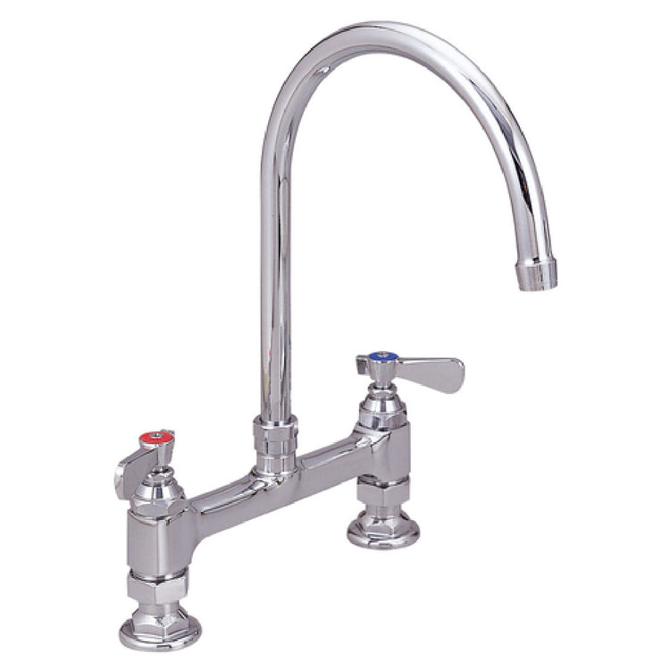 The BK Resources BKF8HD-8G-G OptiFlow™ Heavy Duty Faucet is a precision-engineered fixture designed for demanding environments that require robust and reliable water dispensing solutions. This deck mount faucet features an 8-inch on-center (OC) layout, accommodating a wide range of installation setups. Central to its design is the 8-inch gooseneck spout, which provides ample clearance and flexibility for various tasks, making it ideal for professional kitchens and industrial facilities. Enhanced with a double O-ring spout seal, this faucet minimizes leakage, ensuring long-lasting performance and durability. The inclusion of 1/4 turn ceramic cartridges enables smooth operation and precise control over water flow, distinguishing this model in terms of efficiency and user convenience. An integral check valve is incorporated to maintain system integrity and prevent backflow, further enhancing its reliability. Aesthetically, the faucet boasts a high polished chrome finish, offering both a sophisticated look and resistance to corrosion. Importantly, the BKF8HD-8G-G is lead-free, ensuring safety and compliance with health standards. It holds certifications from NSF, cCSAus, and ADA, affirming its adherence to high safety and accessibility standards. This faucet stands out as a premium choice for institutions prioritizing quality, safety, and efficiency in their water fixtures.