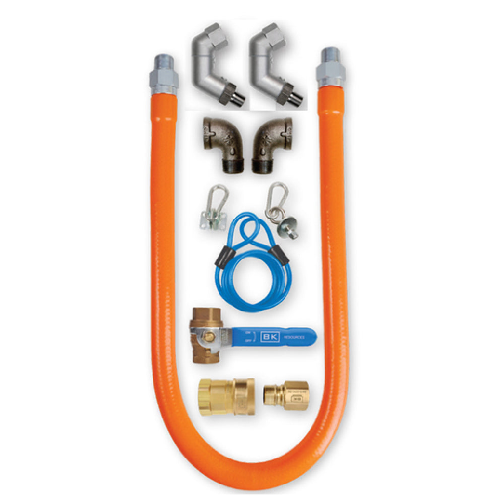 The BK Resources BKG-GHC-10024-2SW3 Swivel Pro™ Connection Kit is expertly engineered for demanding environments requiring reliable fluid connection solutions. This comprehensive kit features a 24-inch long stainless steel hose with a 1-inch internal diameter, enhanced with a radial wrap and a protective translucent coating, ensuring durability and flexibility. Integral to its design are two Swivel Pro™ connections that facilitate smooth, 360-degree rotational movement, reducing stress and wear on the hose. Complementing these connections are two male-to-female 90-degree elbows, allowing for versatile installation configurations. The kit also includes a restraining cable and hardware, providing added safety and stability. The inclusion of a shut-off valve and a quick disconnect feature underscores its suitability for applications that demand rapid connection and disconnection, enhancing operational efficiency. This product is certified by cCSAus, assuring compliance with applicable safety standards. Packaged in a point-of-purchase box, the BK Resources BKG-GHC-10024-2SW3 Swivel Pro™ Connection Kit is ideal for various industry segments, from commercial kitchens to industrial facilities, offering a robust and dependable solution for fluid management needs.