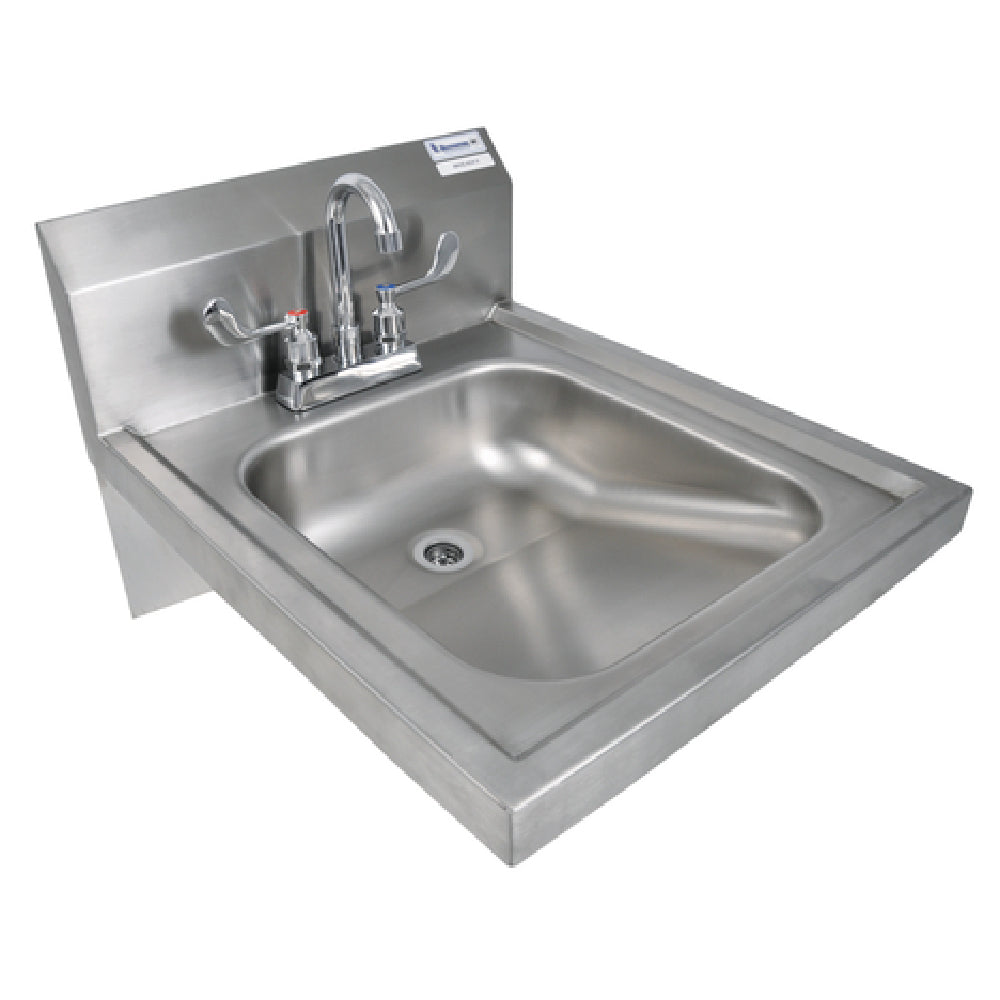 The BK Resources BKHS-ADA-D-P-G ADA Hand Sink is a versatile wall-mounted unit designed for diverse settings requiring compliance with ADA standards. With dimensions of 14" wide, 16" front-to-back, and a 5" deep bowl, it is compact yet functional. This hand sink features a 4" on-center deck mount faucet complete with a 3-1/2" gooseneck spout and wrist blade handles (BKF-4DM-3G-G), ensuring ease of use for all users. An 8" backsplash preserves surrounding walls from splashes and adds to the sink's durability. The marine edge design helps contain spills, while the included basket drain and wall bracket simplify installation and maintenance. Constructed from 18/304 stainless steel, this hand sink combines durability with a sleek appearance, making it suitable for high-traffic environments. The lead-free composition further enhances safety and compliance with health standards. The BK Resources BKHS-ADA-D-P-G ADA Hand Sink is an exemplary choice for facilities in the healthcare, hospitality, and educational sectors, where adherence to ADA compliance is crucial. Its efficient design and robust materials make it an asset for any commercial or institutional space requiring reliable and accessible hand washing solutions.