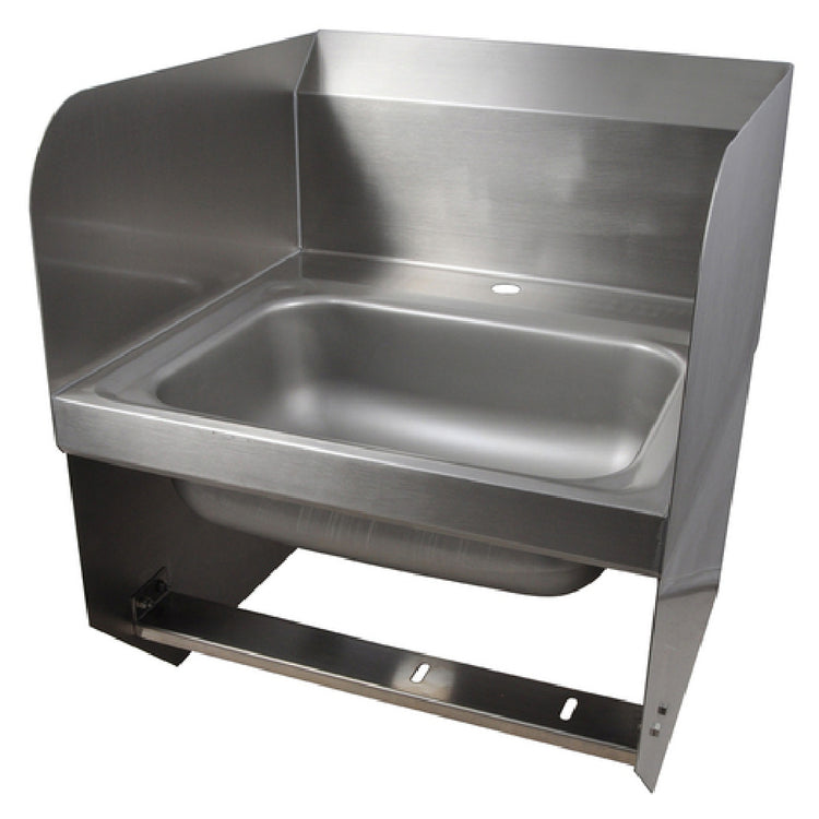 The BK Resources BKHS-D-1410-1-SS-BKK Hand Sink Wall Mount is a compact and efficient sanitation solution measuring 14 inches wide by 10 inches front-to-back with a 5-inch deep bowl. This hand sink is designed for environments where space and hygiene are priorities, featuring side splashes on both the left and right to prevent water spillage and maintain cleanliness. The 7-3/8-inch high backsplash further enhances its functionality by protecting walls from water damage. Crafted from 304 stainless steel, this unit ensures durability and resistance to corrosion, making it ideal for high-moisture settings. It includes a single deck mount faucet hole for easy installation of a faucet, and comes with a basket drain to efficiently handle waste water. The package includes knee and wall brackets, facilitating a secure and versatile installation process. Although it does not come with a knee valve, this NSF-certified hand sink meets strict public health and safety standards, making it suitable for use in foodservice establishments, healthcare facilities, and any industry requiring rigorous hygiene standards. The BK Resources hand sink's robust construction and thoughtful design make it a valuable addition to any professional setting focused on maintaining cleanliness and efficiency.