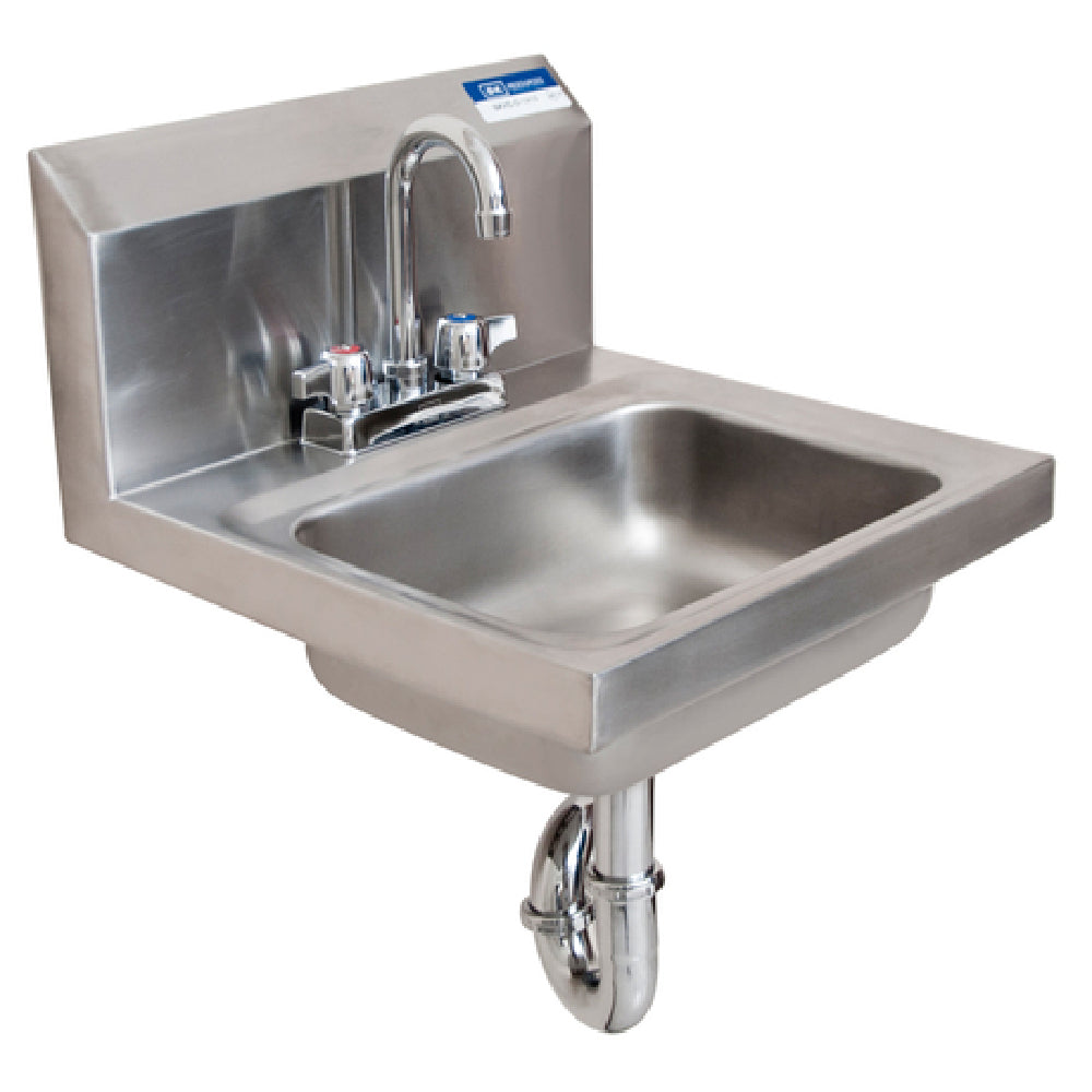 The BK Resources BKHS-D-1410-PT-G Hand Sink Wall Mount is meticulously designed for precision and functionality, ideal for various commercial environments requiring superior hygiene standards. This hand sink boasts a compact yet efficient design, measuring 14 inches in width, 10 inches front-to-back, and with a 5-inch deep bowl. The unit is equipped with 4-inch on-center deck mount faucet holes and comes complete with a BKD-3G-G faucet, enhancing its convenience and usability. The incorporation of color-coded hot and cold indicators ensures intuitive operation, while the 1/4 turn ceramic cartridges promise long-lasting durability. The hand sink includes a 1-7/8-inch basket drain with a crumb cup, facilitating easy maintenance and cleanliness. Constructed with 304 stainless steel, it underscores a commitment to durability and corrosion resistance, making it suitable for demanding settings. Moreover, it includes a P-trap and a wall bracket for seamless installation. This product is NSF certified, guaranteeing adherence to strict public health and safety standards, making it an excellent choice for industries such as food service, healthcare, and laboratory environments where cleanliness is paramount. The BK Resources BKHS-D-1410-PT-G represents a blend of practicality and robust construction, catering effectively to diverse market needs.