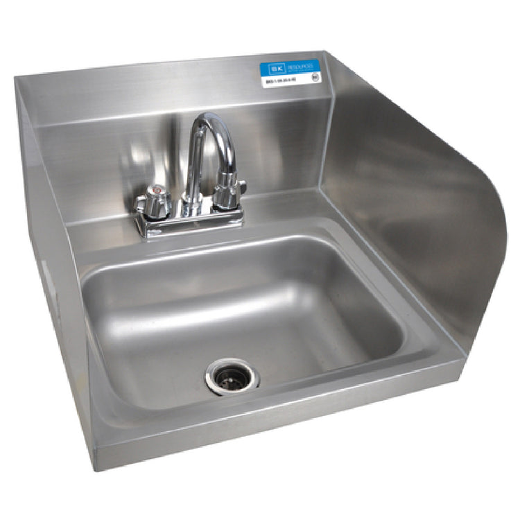 The BK Resources BKHS-D-1410-SS-P-G Hand Sink is a versatile wall-mounted unit, meticulously designed for diverse professional environments that prioritize hygiene and space efficiency. With dimensions of 14 inches in width, 10 inches front-to-back, and a 5-inch deep bowl, this sink offers compact yet practical functionality. It features a 4-inch on-center deck mount faucet (BKD-3G-G), which is lead-free, ensuring compliance with safety standards. For enhanced usability, the sink includes a marine edge and side splashes on both sides, effectively minimizing water spillage and maintaining a clean work area. The inclusion of a basket drain and wall mounting hardware simplifies installation and operation. Constructed from 304 stainless steel, the BKHS-D-1410-SS-P-G exemplifies durability and reliability, making it suitable for rigorous use in commercial kitchens, healthcare facilities, and food service establishments. This sink is NSF certified, underscoring its adherence to stringent public health and safety regulations. Its robust design and practical features meet the diverse needs of industry professionals, ensuring a high standard of cleanliness and operational efficiency in any setting.