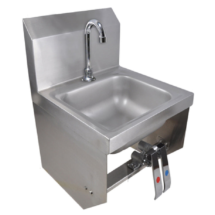 The BK Resources BKHS-D-SS-1-BKK-PG Space Saver Hand Sink is a highly efficient solution designed for environments where space is at a premium. This wall-mounted hand sink measures 9 inches in width, 9 inches from front to back, and has a 5-inch deep bowl, making it a compact yet functional choice for a variety of settings. It features a single deck mount 3-1/2 inch gooseneck spout faucet that is both elegant and practical, allowing for easy handwashing without taking up excess space. The dual knee valve pedals provide a hands-free operation, enhancing hygiene and convenience, especially in busy kitchens or healthcare settings. An 8-inch high backsplash protects walls from water damage, ensuring cleanliness and durability. This hand sink is constructed of 304 stainless steel, renowned for its strength and resistance to corrosion, making it a reliable choice for long-term use. The unit comes complete with essential components including a drain, knee valve bracket, and wall mounting hardware, ensuring seamless installation. NSF certification attests to its compliance with rigorous health and safety standards, making the BK Resources BKHS-D-SS-1-BKK-PG Space Saver Hand Sink a prudent investment for various industrial and commercial applications.