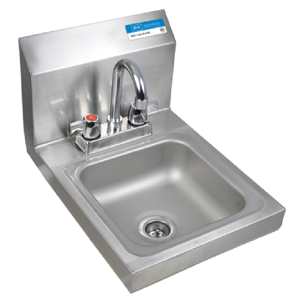 The BK Resources BKHS-D-SS-P-G Space Saver Hand Sink Wall Mount is a compact and efficient sanitation solution, specifically crafted for environments where space is at a premium. Measuring 9 inches in width, 9 inches in front-to-back depth, and featuring a 5-inch deep bowl, this sink is designed with practicality in mind. It comes equipped with a 4-inch on-center deck mount faucet (BKD-3G-G), which is lead-free, ensuring safety and compliance with health standards. The marine edge design helps contain splashes and maintains a tidy workspace, while the 7-1/2-inch high backsplash provides additional protection against water damage to surrounding areas. Included with the sink are a basket drain and wall mounting hardware, facilitating straightforward installation. Constructed from high-quality 304 stainless steel, this hand sink is both durable and easy to clean, suitable for high-demand settings. Recognized with NSF certification, it meets rigorous public health and safety standards. The BK Resources BKHS-D-SS-P-G Space Saver Hand Sink is an excellent choice for industries such as foodservice, healthcare, and education, where efficient use of space and superior hygiene are paramount.