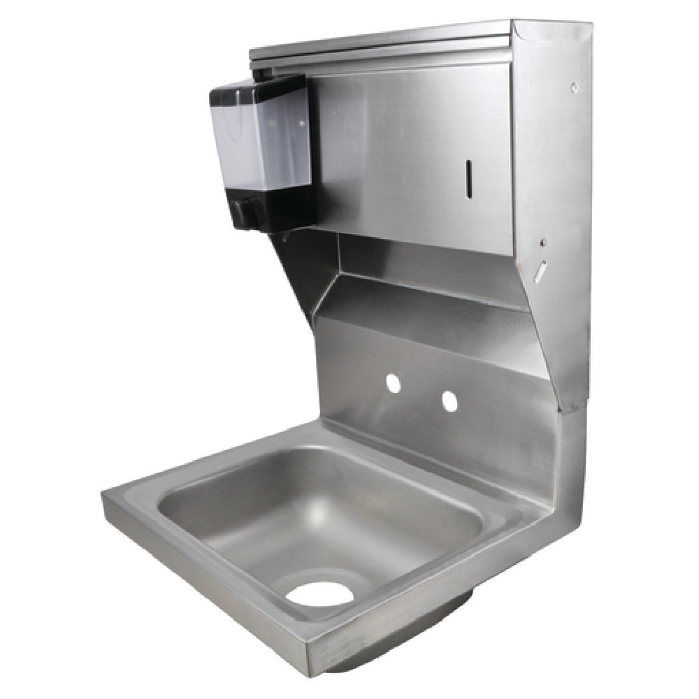 The BK Resources BKHS-W-1410-4D-TD hand sink is a compact and versatile wall-mounted unit designed to meet the demanding needs of various commercial environments. With dimensions measuring 14 inches wide, 10 inches front-to-back, and a 5-inch deep bowl, this hand sink is crafted for spaces where efficiency is crucial. The unit features 4-inch on-center splash mount faucet holes, allowing easy installation of compatible faucets. A notable feature is its marine edge, which prevents spillage and ensures cleanliness in high-traffic areas. Additionally, the hand sink comes with an integral towel dispenser, accommodating BK-MFPT "C" fold towels, enhancing its utility in maintaining hygiene. Constructed from 304 stainless steel, known for its durability and resistance to corrosion, this hand sink is built to last in rigorous settings such as restaurants, healthcare facilities, and laboratories. The inclusion of wall mounting hardware simplifies the installation process, ensuring secure placement on any wall surface. The BKHS-W-1410-4D-TD adheres to NSF standards, affirming its compliance with strict public health and safety regulations. This combination of practicality, robust construction, and compliance makes it an essential component for industries prioritizing hygiene and efficiency.