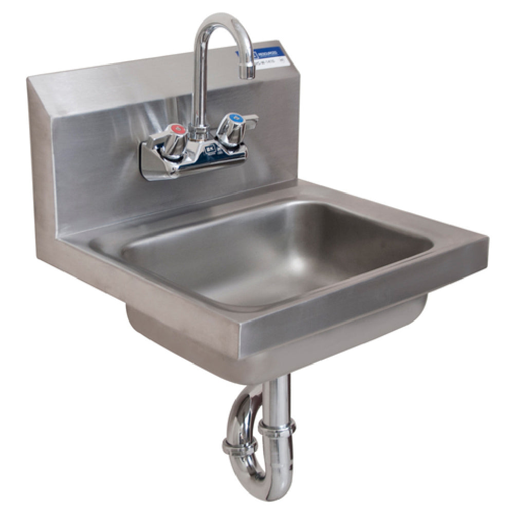 The BK Resources BKHS-W-1410-PT-G Hand Sink is a wall-mounted fixture designed with precision and functionality in mind, featuring a spacious 14" wide by 10" front-to-back by 5" deep bowl. This compact yet efficient sink includes 4" on-center splash mount faucet holes and comes equipped with one BKF-W-3G-G faucet, ensuring effortless installation for users. Built from robust 304 stainless steel, the sink provides durability and resilience, ideal for demanding environments. It includes a 1-7/8" drain opening, a P-Trap, and a basket drain, all designed to enhance drainage performance and ease of use. The mounting bracket provided simplifies the installation process, making it suitable for various settings, from commercial kitchens to healthcare facilities. Certified by NSF, this hand sink meets rigorous public health and safety standards, making it a reliable choice for establishments prioritizing hygiene. Its thoughtful design and compact dimensions make the BKHS-W-1410-PT-G Hand Sink a versatile and practical solution for professionals seeking quality and efficiency in high-traffic settings.