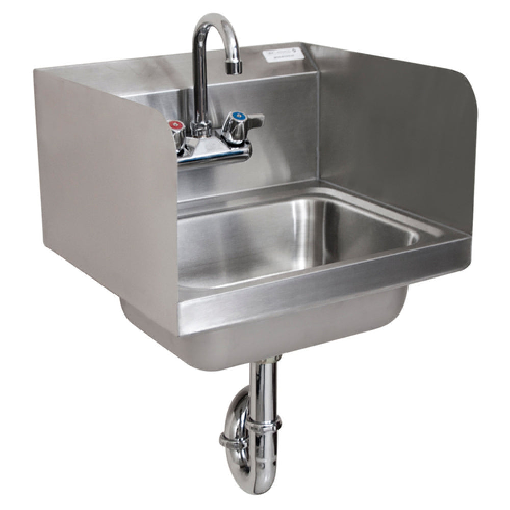 The BK Resources BKHS-W-1410-SS-PT-G Hand Sink is a streamlined wall-mounted unit engineered for efficiency and hygiene in commercial settings. With dimensions of 14 inches in width, 10 inches in depth front-to-back, and a 5-inch deep bowl, it is compact yet functional, fitting seamlessly into various spaces. The hand sink is designed with 4-inch O-C splash mount faucet holes and includes the BKF-W-3G-G faucet, enhancing its value for both installation and daily use. Its side splashes on the left and right help contain water, maintaining a clean workspace. The inclusion of a P-Trap ensures efficient drainage through a 1-7/8 inch drain opening, complemented by a basket drain and mounting bracket for straightforward installation. Crafted from 304 stainless steel, the hand sink is durable and resists corrosion, making it suitable for diverse environments such as restaurants, laboratories, and healthcare facilities. Adhering to NSF standards, it meets strict public health and safety requirements. This hand sink is a versatile solution for any industry requiring reliable and hygienic handwashing facilities, offering a combination of practicality and quality in its design and material composition.