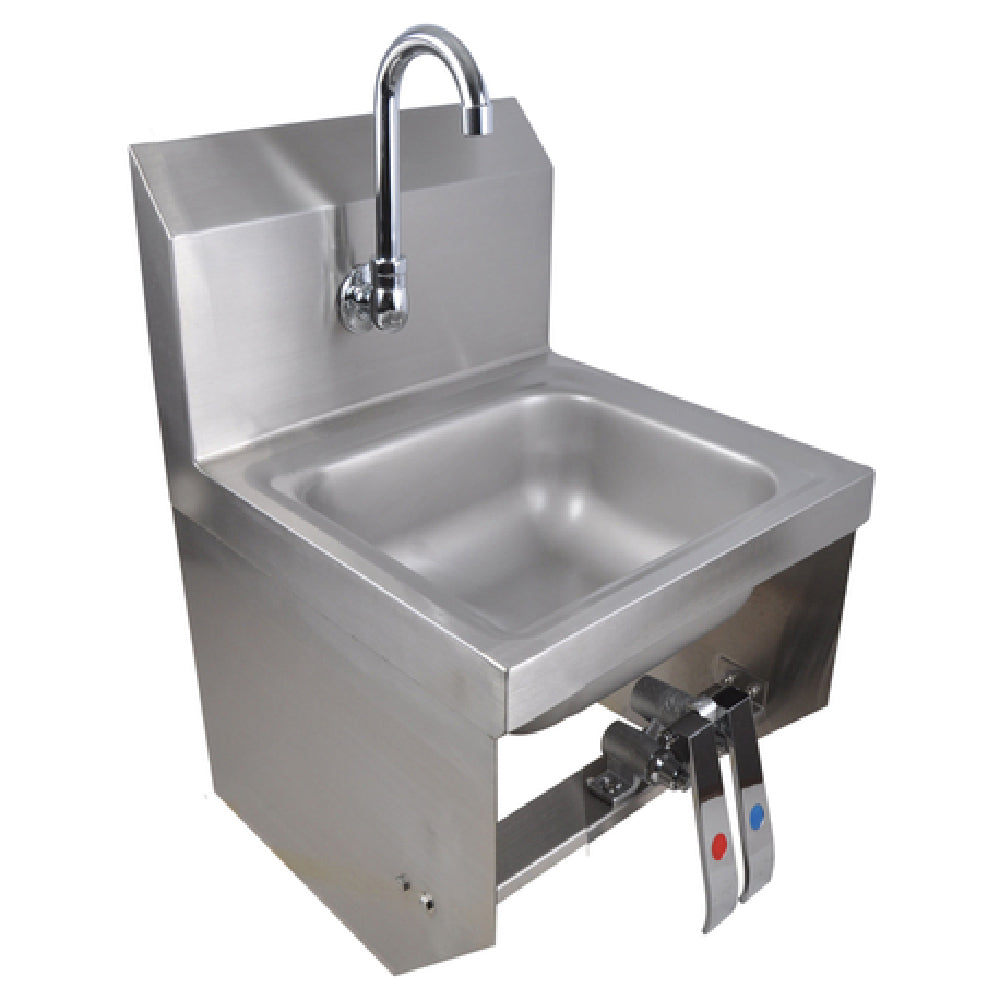The BK Resources BKHS-W-SS-1-BKK-PG Space Saver Hand Sink is a compact and efficient solution designed for environments where space is at a premium. With dimensions of 9 inches wide by 9 inches front-to-back and a 5-inch deep bowl, this wall-mounted hand sink is expertly crafted to fit into tight spaces without compromising functionality. It features a single splash mount with a 3-1/2-inch gooseneck faucet, providing easy access to water flow. The dual knee valve pedals offer hands-free operation, enhancing hygiene and convenience in high-traffic areas. An 8-inch high backsplash protects walls from water damage, ensuring cleanliness and maintenance ease. This hand sink includes essential components like a drain, knee valve bracket, and wall mounting hardware, facilitating straightforward installation and use. Constructed from 304 stainless steel, the BKHS-W-SS-1-BKK-PG is durable and corrosion-resistant, making it suitable for various industries such as food service, healthcare, and industrial settings. Its NSF certification assures compliance with public health standards, making it a reliable choice for ensuring sanitation and efficiency in professional environments. The BK Resources BKHS-W-SS-1-BKK-PG Space Saver Hand Sink embodies practicality and robust construction, catering to the needs of diverse markets requiring compact and effective handwashing solutions.