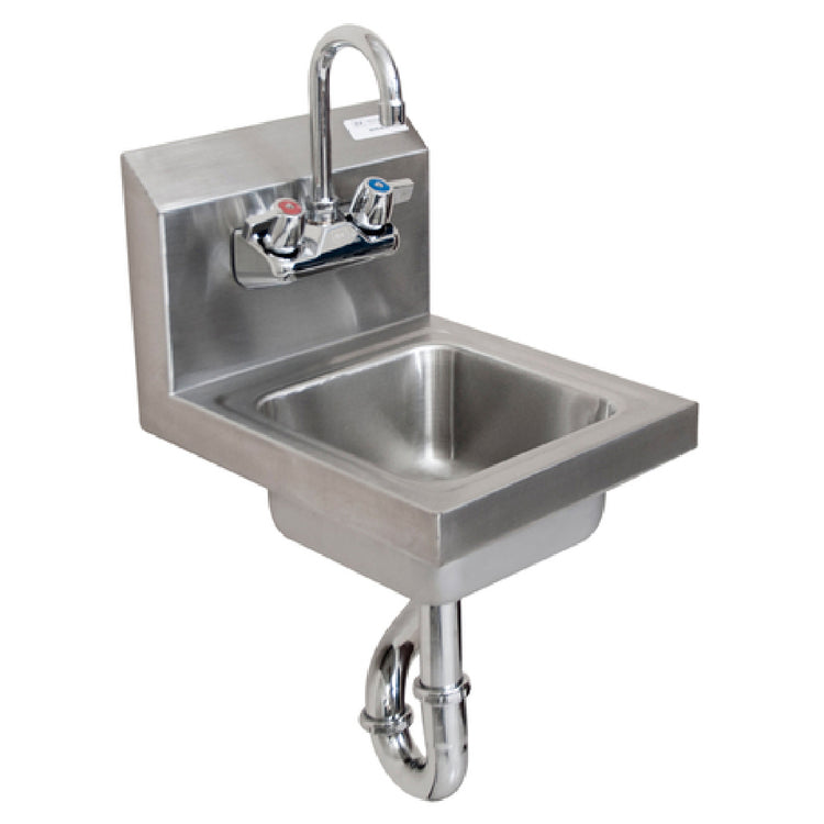 The BK Resources BKHS-W-SS-PT-G Space Saver Hand Sink is expertly designed for environments where space is at a premium, offering a compact yet efficient solution for handwashing needs. This wall-mounted unit measures 9 inches in width, 9 inches front-to-back, and features a 5-inch deep bowl, making it ideal for tight spaces in commercial kitchens or food service areas. The sink is equipped with 4-inch O.C. splash mount faucet holes and includes the BKF-W-3G-G faucet, ensuring ease of installation and use. Featuring a 1-7/8-inch drain opening, this sink comes complete with a P-trap, basket drain, and mounting bracket, streamlining the installation process. Constructed from durable 304 stainless steel, the BKHS-W-SS-PT-G guarantees longevity and resistance to corrosion, making it a reliable choice for high-traffic areas. The NSF certification highlights its compliance with rigorous health and safety standards, making it an excellent option for various industry segments, including restaurants, hospitals, and laboratories, where hygiene and efficient use of space are critical. This hand sink efficiently combines form and function, delivering dependable performance in a compact footprint.