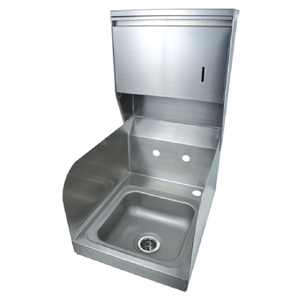 BK Resources BKHS-W-SS-SS-TD Space Saver Hand Sink is an expertly designed wall-mounted unit, offering a compact solution with its 9" wide x 9" front-to-back x 5" deep bowl. Engineered for efficiency, it features 4" OC splash mount faucet holes, accommodating a variety of plumbing setups. The unit is distinguished by its marine edge design, which helps contain splashes and maintain cleanliness. Integrated into the sink is an innovative towel dispenser, compatible with BK-MFPT "C" fold towels, ensuring convenience in high-traffic environments. The inclusion of a deck mount soap dispenser adds to its practicality, making it ideal for commercial kitchens or restrooms where space is at a premium. Side splashes on both the left and right further enhance its functionality by providing additional splash protection. Constructed from 304 stainless steel, this hand sink guarantees durability and corrosion resistance, essential for maintaining hygiene standards. The comprehensive package includes a basket drain and wall mounting hardware, facilitating straightforward installation. Certified by NSF, this hand sink meets stringent health and safety criteria, making it a reliable choice for food service establishments and other professional settings where space-saving, efficient handwashing solutions are crucial.