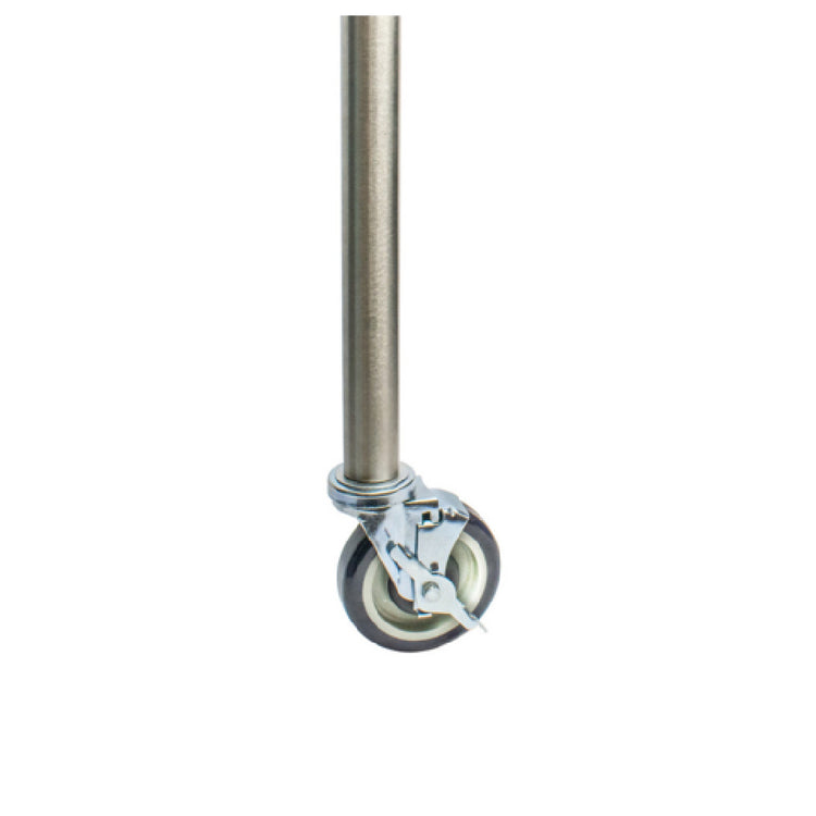 The BK Resources BKLC-S-34 Leg With Caster is designed for optimal stability and mobility, standing at a height of 33-1/4 inches. Crafted from high-quality 16-gauge T-304 stainless steel, this leg is both durable and resistant to corrosion, making it an excellent choice for environments where hygiene and longevity are paramount. The round design with a 1-5/8 inch outside diameter adds to its structural integrity, ensuring that it can support a variety of applications within the food service and industrial sectors. Included are the 5SBR-RA-PLY-TLB casters, enhancing the product's versatility by allowing for easy movement across different surfaces. The BKLC-S-34 is particularly well-suited for commercial kitchens, laboratories, and any setting where equipment mobility is frequently required. Its robust construction and superior materials make it a reliable component for professionals seeking both functionality and efficiency in their workspace. This product exemplifies the commitment to quality and innovation, serving diverse industries with its practical design and remarkable endurance.