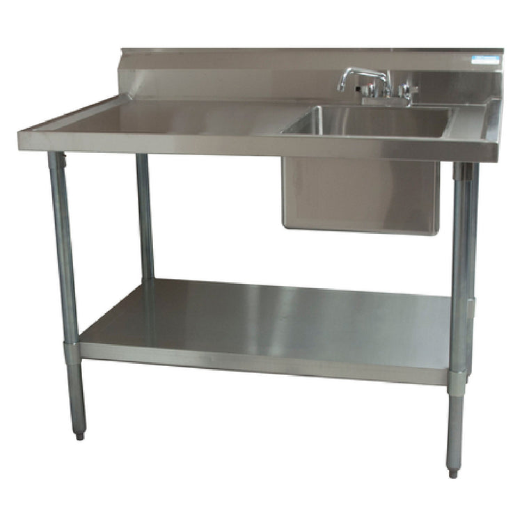 The BK Resources BKMPT-3060G-R-P-G Work Table with Prep Sink is a versatile stainless steel workstation designed to enhance efficiency in commercial kitchens. Featuring a right-positioned sink and measuring 60"W x 30"D x 41-3/4"H, this work table is ideal for food preparation areas where space optimization and hygiene are paramount. The 18/304 stainless steel top is constructed with a marine edge, which helps to contain spills and maintain cleanliness. For added functionality, it includes a 6" backsplash to protect walls from water splashes. The integrated sink bowl is 16" wide x 20" front-to-back x 10" deep, ensuring ample space for washing and rinsing tasks. Equipped with a deck mount lead-free faucet with an 8" swing spout (BKD-8-G), this unit promotes water efficiency and accessibility. The galvanized steel undershelf provides adjustable storage options, while the galvanized steel legs with metal over plastic adjustable bullet feet ensure stability on uneven surfaces. NSF certification assures adherence to public health and safety standards, making this work table a reliable addition to any professional kitchen seeking durability and seamless integration of prep and wash tasks.