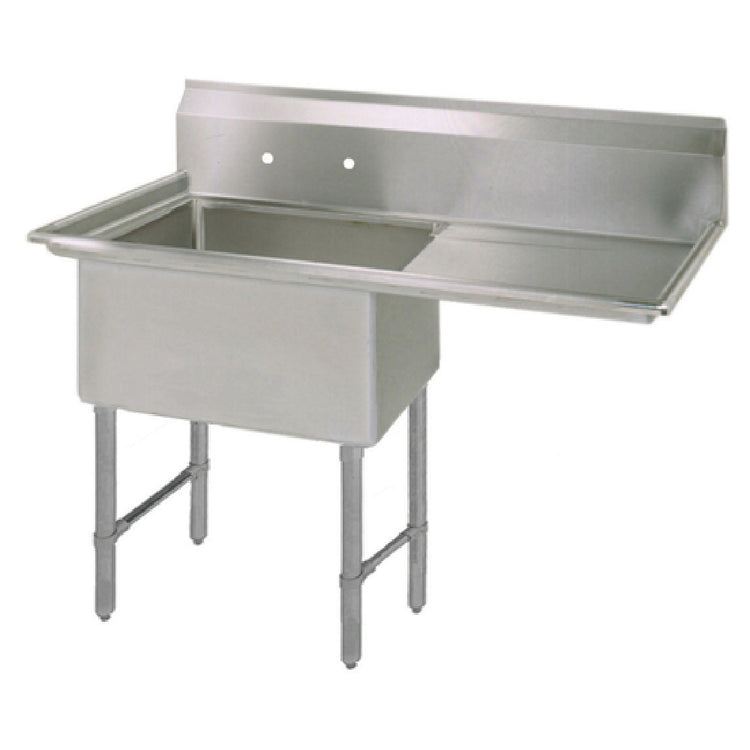 The BK Resources BKS-1-1824-14-24RS Sink One Compartment 44-1/2"W x 29-13/16"D x 43-3/4"H Overall Size is a meticulously designed sink solution for a variety of commercial environments, including restaurants, hotels, and catering services. Featuring an 18" wide x 24" front-to-back x 14" deep compartment, it provides ample space for efficient cleaning tasks. The sink is equipped with a 24" drainboard on the right, enhancing functionality for drying or additional workspace. A 9"H backsplash is integrated to protect walls and maintain cleanliness. The unit is designed with 8" OC splash mount faucet holes, accommodating a range of faucet installations. The 1-1/2" rolled edges on the front and sides ensure safety and a sleek appearance. Constructed from durable 18/304 stainless steel, including stainless steel legs and side crossbracing, the sink guarantees longevity and stability. Adjustable stainless steel over plastic bullet feet allow for level installation on uneven surfaces. This sink is NSF certified, showcasing its commitment to public health and safety standards. The BK Resources BKS-1-1824-14-24RS Sink is an essential asset for any food service operation demanding reliable and efficient cleaning solutions.
