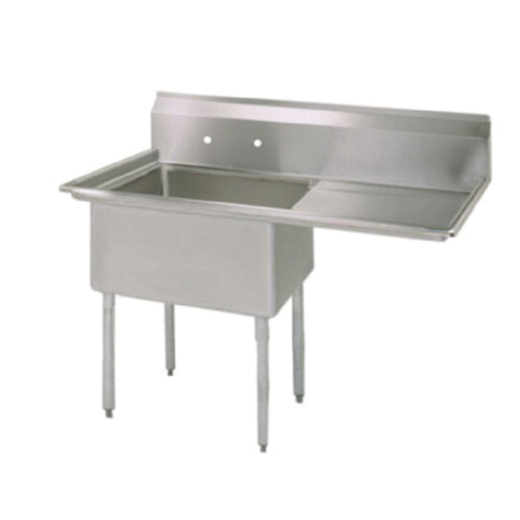 The BK Resources BKS-1-24-14-24R Sink One Compartment is a robust and versatile solution tailored for various sectors requiring efficient and durable sink installations. With an overall size of 50-1/2"W x 29-13/16"D x 43-3/4"H, it features a single compartment measuring 24" wide x 24" front-to-back x 14" deep. This design is complemented by a practical 24" drainboard on the right, making it suitable for environments where space optimization and functionality are paramount. The sink is constructed from 18/304 stainless steel, ensuring longevity and resistance to corrosion, a key consideration for industries such as food service and healthcare where hygiene is critical. The 9"H backsplash and 8" OC splash mount faucet holes provide additional utility, accommodating various faucet configurations. Enhanced by 1-1/2" rolled edges on the front and sides, this sink offers both safety and a professional appearance. Galvanized steel legs with adjustable, high-impact corrosion-resistant feet provide stability and adaptability on uneven surfaces. Included with the sink is a basket drain (BKDR-4), adding to its functional value. NSF certification underscores its compliance with health and safety standards, making the BK Resources BKS-1-24-14-24R Sink an excellent choice for businesses demanding reliability and quality in their kitchen or service areas.