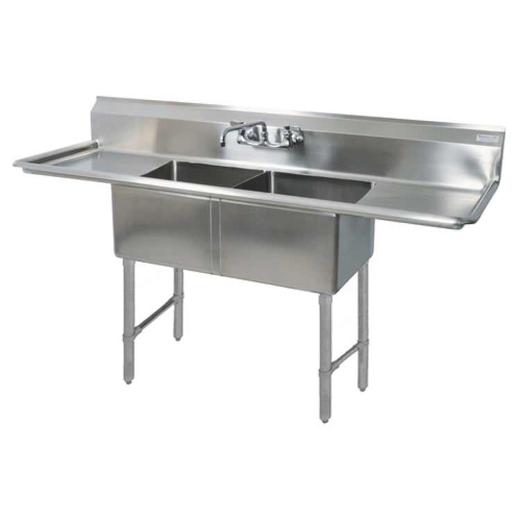 BK Resources BKS-2-18-12-18TS Sink Two Compartment 72"W X 23-13/16"D X 43-3/4"H Overall Size is an industrial-grade sink designed for efficiency and durability in demanding kitchen environments. This sink features dual compartments, each measuring 18 inches wide, 18 inches front-to-back, and 12 inches deep, providing ample space for washing and rinsing activities. It includes two 18-inch drainboards, located on the left and right, facilitating convenient drainage and workspace management. The sink is constructed from high-quality 18/304 stainless steel, known for its robustness and resistance to corrosion, ensuring longevity in busy settings. The design incorporates a 9-inch backsplash to protect walls from water splashes, and it comes with 8-inch OC splash mount faucet holes for easy installation of compatible faucets. The 1-1/2 inch rolled edges on the front and sides enhance safety and add to the aesthetic appeal. Stainless steel legs and side crossbracing provide exceptional stability, while the adjustable stainless steel over plastic bullet feet allow for customizable height adjustments. Included with the sink are basket drains (BKDR-4), contributing to effective debris management. The NSF certification underscores its compliance with high safety and sanitation standards, making it an ideal choice for commercial kitchens and food service operations.