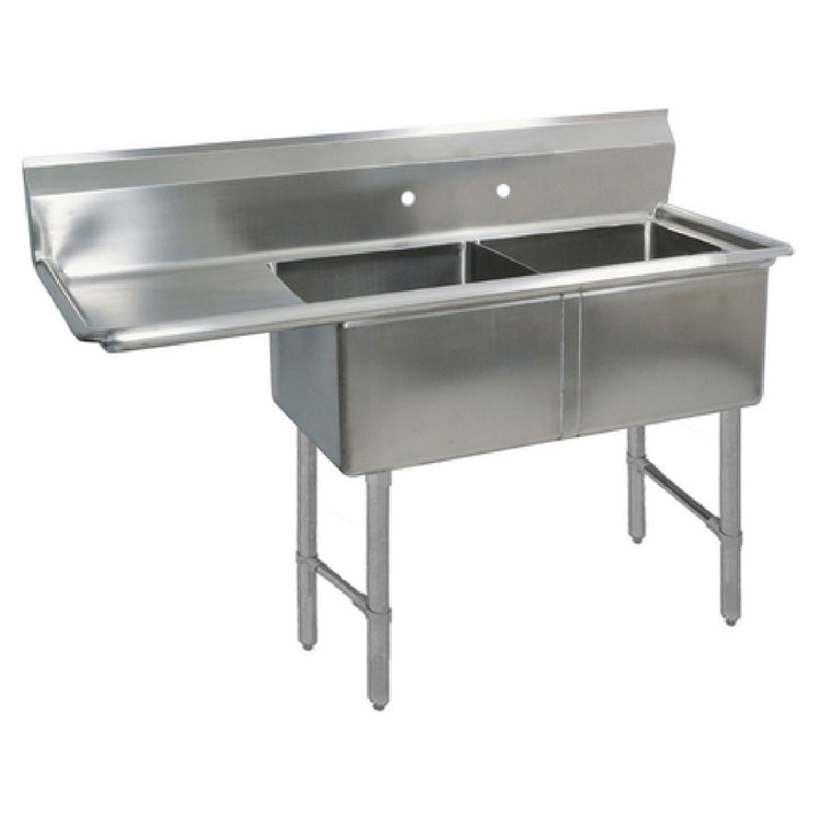 The BK Resources BKS-2-24-14-24LS Sink Two Compartment is designed to meet the demanding needs of commercial kitchens with its comprehensive features. Measuring 74-1/2"W x 29-13/16"D x 43-3/4"H, this sink provides ample workspace with its dual 24" wide x 24" front-to-back x 14" deep compartments, ideal for efficiently handling large kitchen tasks. The inclusion of a 24" drainboard on the left side enhances its functionality, offering convenience for drying and additional workspace. Enhanced with a 9"H backsplash, it effectively protects walls from splashes and maintains cleanliness. The sink is equipped with 8" OC splash mount faucet holes, facilitating easy installation of faucets. Its construction from 18/304 stainless steel, complemented by stainless steel legs and side crossbracing, ensures long-lasting durability and stability. The 1-1/2" rolled edges on the front and sides provide added safety and structural integrity. Adjustable stainless steel over plastic bullet feet allow for leveling on uneven floors. Included basket drains (BKDR-4) ensure efficient water drainage. NSF certification underscores its adherence to public health standards, making it a reliable choice for restaurants, hotels, and catering businesses seeking quality and compliance in their kitchen equipment.
