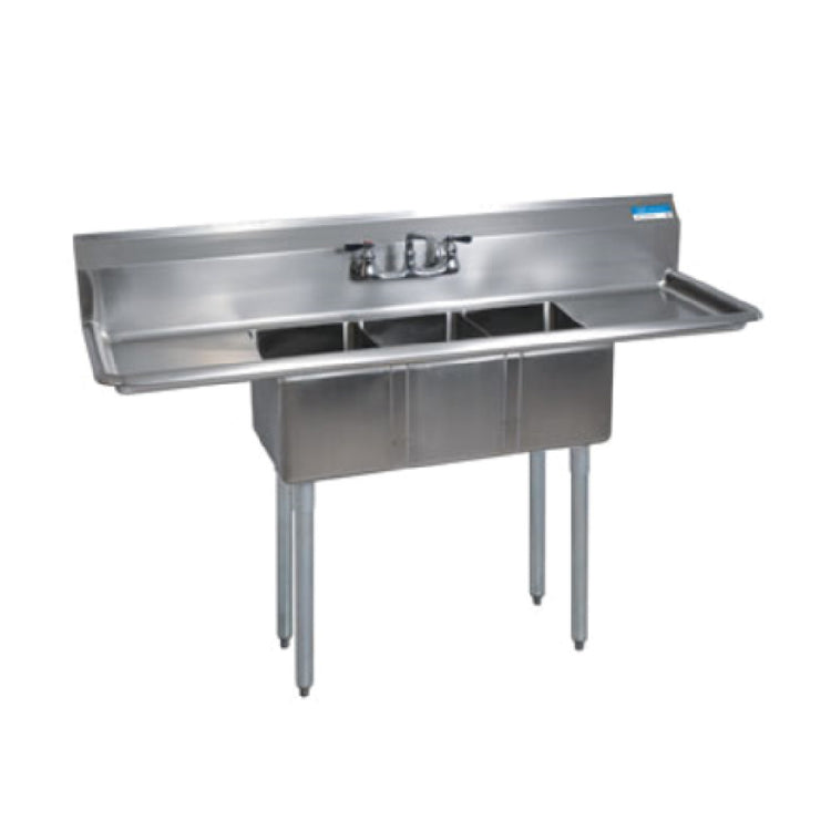 The BK Resources BKS-3-1220-12-12T Convenience Store Sink is a three-compartment unit meticulously designed for optimal utility in various commercial settings. With an overall size of 60"W x 25-13/16"D x 39-3/4"H, this sink accommodates a range of washing needs with its three 12" wide x 20" front-to-back x 12" deep compartments. Featuring two 12" drainboards on both the left and right sides, it ensures efficient workflow and space management. The 9"H backsplash and 8" OC splash mount faucet holes provide additional convenience, facilitating easy cleaning and effective water containment. Its 1-1/2" rolled edges on the front and sides enhance durability and safety during use. Constructed from high-quality 18/304 stainless steel for both the deck and bowl, this sink ensures long-lasting performance and resistance to corrosion. Supported by galvanized steel legs with adjustable high-impact corrosion-resistant feet, it is designed to withstand the rigors of everyday use. Included basket drains further contribute to its functionality. Certified by NSF, this sink aligns with industry standards for public health and safety, making it a reliable choice for convenience stores, delis, and other food service environments requiring robust and practical sink solutions.