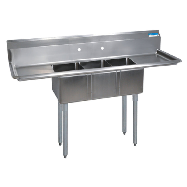 The BK Resources BKS-4-1620-14-18TS Sink Four Compartment is a versatile and robust choice for commercial kitchens, designed to meet the diverse needs of the foodservice industry. With an overall size of 100"W x 25-13/16"D x 43-3/4"H, this sink features four compartments each measuring 16" wide x 20" front-to-back x 14" deep, offering ample space for various kitchen tasks. The inclusion of two left and right 18" drainboards enhances functionality by providing additional space for drying and organizing. A 9"H backsplash helps in maintaining cleanliness by preventing water spillage. Equipped with two sets of 8" OC splash mount faucet holes, the sink facilitates easy installation of compatible faucets. The 1-1/2" rolled front and side edges add to the sink's durability and safety, preventing injury from sharp edges. Constructed from 18/304 stainless steel, the sink promises longevity and resistance to corrosion, while the stainless steel legs and side crossbracing ensure stability. Adjustable stainless steel over plastic bullet feet allow for level installation on uneven surfaces. The inclusion of basket drains further aids in efficient water management. Certified by NSF, this sink meets public health and safety standards, making it an indispensable asset for any commercial kitchen setting.