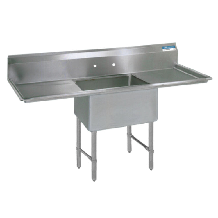 The BK Resources BKS6-1-24-14-24TS Sink One Compartment is a versatile and robust solution for commercial kitchens, measuring 75-1/4"W x 29-1/2"D x 44-1/16"H in overall size. This one-compartment sink features a spacious 24"-wide x 24"-front-to-back x 14"-deep compartment, making it suitable for handling various kitchen tasks with ease. With dual 24" drainboards on both the left and right sides, this sink provides ample space for drying and organizing kitchenware. A 10"H backsplash ensures that walls remain clean and protected from water splashes. The sink is engineered with 8"-on-center splash mount faucet holes, allowing for easy installation of compatible faucets. Its 1-1/2" rounded front and side edges enhance safety and comfort during use. Constructed from premium 16/304 stainless steel for both the deck and bowl, this sink promises durability and resistance to corrosion. Stainless steel legs and side bracing, coupled with adjustable stainless steel over plastic bullet feet, ensure stability and adaptability on uneven surfaces. Additionally, it includes a basket drain for efficient water disposal. Certified by NSF, the BK Resources BKS6-1-24-14-24TS Sink is a reliable choice for maintaining hygiene standards in various food service environments.