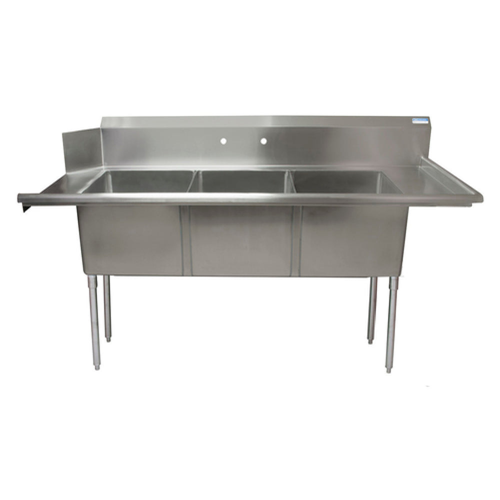 The BK Resources BKSDT-3-1820-14-RSPG Soiled Dishtable & Three-Compartment Sink With Pre-Rinse Faucet is a versatile and robust solution for commercial kitchens, offering a comprehensive setup for efficient dishwashing operations. Measuring 72 inches in width, 30-3/8 inches in depth, and 44 inches in height, this unit is designed for right-to-left operation. It features three compartments, each 18 inches wide, 20 inches front-to-back, and 14 inches deep, providing ample space for washing, rinsing, and sanitizing tasks. The 10-inch high backsplash ensures cleanliness by minimizing splashes. The package includes the BKF-SMPR-WB-G pre-rinse assembly, enhancing pre-wash efficiency. Additionally, it comes with three BK-LWR-1 lever drains and three BKDR-4 basket drains for effective water management. Two BK-SDTS tray guides and one BK-PRB-5 pre-rinse basket are also included, optimizing workflow. Constructed from 18/304 stainless steel, the dishtable features 1-5/8 inch rolled edges for safety, stainless steel legs and side bracing for durability, and adjustable stainless steel over plastic bullet feet for stability. NSF certification underscores its compliance with industry standards, making it a reliable choice for various segments within the food service industry.