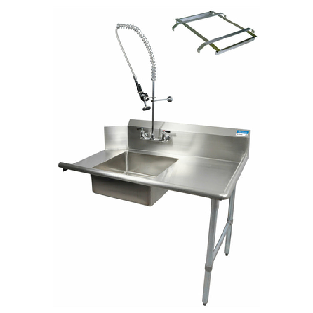 The BK Resources BKSDT-60-R-P2-G Soiled Dishtable is a meticulously crafted unit designed for efficiency and durability in commercial kitchen settings. With a straight design, this dishtable measures 60"W x 30-3/8"D x 46-1/4"H and features a right-to-left operation flow, optimizing space and workflow in dishwashing areas. The unit is constructed with an 18/304 stainless steel top, ensuring longevity and resistance to corrosion. It includes a 20" x 20" x 8" deep pre-rinse sink, paired with an 8" OC splash mount pre-rinse faucet, model BKF-SMPR-WB-G, facilitating effortless dish pre-cleaning. The 10"H backsplash and raised rolled edges on the front and sides enhance safety and cleanliness by preventing spillage. Additionally, the dishtable includes a rack guide, model BK-SDTS, and a basket drain, model BKDR-4, which support efficient dish handling. The galvanized legs and side bracing provide robust support, while the high-impact corrosion-resistant adjustable bullet feet ensure stability on uneven surfaces. Certified by NSF, this soiled dishtable adheres to strict public health and safety standards, making it a reliable choice for a wide range of food service operations seeking to enhance their dishwashing efficiency.