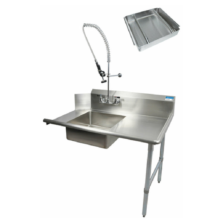The BK Resources BKSDT-60-R-P3-G Soiled Dishtable Straight Design 60-W X 30-3/8-D X 46-1/4-H is a meticulously crafted unit engineered for efficiency in commercial dishwashing environments. Featuring a robust 18/304 stainless steel top, it ensures durability and longevity in high-use settings. The dishtable operates from right to left, facilitating a streamlined workflow. Its integrated 20-W X 20-D X 8-H pre-rinse sink is complemented by an 8-OC splash mount pre-rinse faucet (BKF-SMPR-WB-G), enhancing its practicality for removing food residues before washing. The 10-H backsplash prevents water spills, maintaining cleanliness in the workspace. Raised rolled edges on the front and sides add an extra layer of safety and spill containment. The unit also includes a pre-rinse basket (BK-PRB-5) with a basket drain (BKDR-4) for efficient water drainage. Constructed with galvanized legs and side bracing, it boasts high impact corrosion-resistant adjustable bullet feet, ensuring stability and adaptability on uneven surfaces. The dishtable is NSF certified, confirming its adherence to public health standards, making it a reliable choice for various segments within the food service industry, from bustling restaurants to large-scale catering operations, providing consistent performance and reliability.