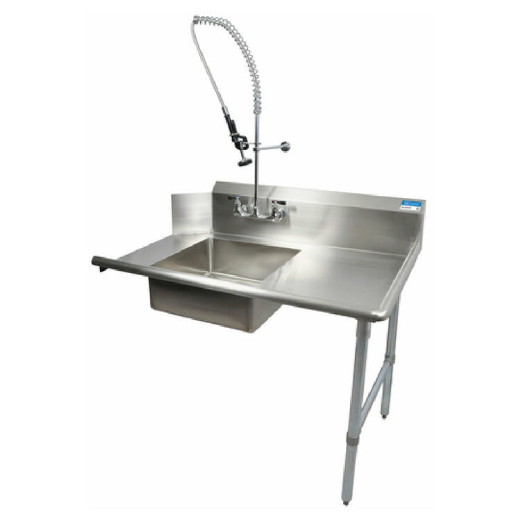 The BK Resources BKSDT-60-R-SS-P-G Soiled Dishtable Straight Design 60"W X 30-3/8"D X 46-1/4"H is a robust and efficient solution for commercial kitchens that require efficient dish handling and cleaning processes. Crafted with an 18/304 stainless steel top, this dishtable ensures durability and resistance to corrosion, essential for high-demand environments. Designed for right-to-left operation, it includes a 20" x 20" x 8" deep pre-rinse sink and an 8" OC splash mount pre-rinse faucet (BKF-SMPR-WB-G), facilitating seamless dish pre-rinsing. The 10"H backsplash protects walls from splashes, while the raised rolled edges on the front and sides prevent water spillage, maintaining a clean workspace. Furthermore, the product incorporates a basket drain (BKDR-4) for efficient water disposal. The stainless steel legs and side bracing provide stability, and the stainless steel over plastic adjustable bullet feet ensure level positioning on varied surfaces. As an NSF certified product, it meets public health and safety standards, making it an ideal choice for professional kitchens aiming for efficiency and hygiene. Its design and specifications make the dishtable a valuable asset in ensuring streamlined operations in diverse food service settings.