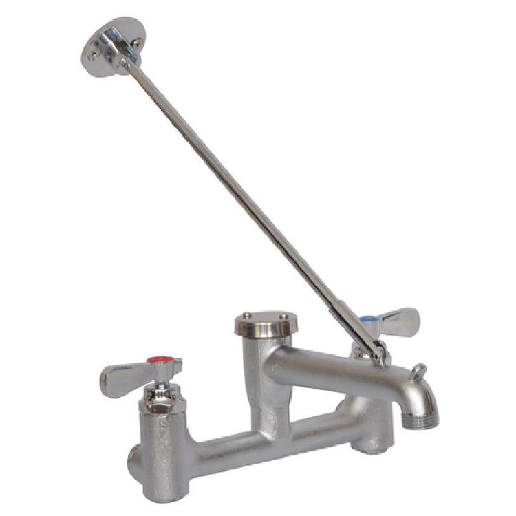 The BK Resources BKSF-WB3 WorkForce™ Service Faucet With Vacuum Breaker Splash-mounted is a specialized fixture designed for industrial and commercial applications, providing reliability and efficiency in various settings. This service faucet features a vacuum breaker, a crucial component that prevents backflow and maintains water purity, making it an essential choice for maintaining hygienic standards. The splash-mounted design allows for easy installation and space-saving advantages. Integral check valves are incorporated to ensure consistent water flow control. The 1/4 turn ceramic valves provide durability and ease of use, minimizing wear and tear over time. A built-in bucket holder enhances convenience for users who frequently need to fill large containers. The garden hose threaded spout offers versatility, accommodating a range of attachments for different tasks. Additionally, the faucet comes with a wall bracket, enhancing stability and installation security. The BK Resources BKSF-WB3 is well-suited for facilities such as laboratories, food service establishments, and maintenance departments where dependable water delivery and system integrity are paramount. Its robust construction and practical features make it a valuable asset for operations seeking both functionality and compliance with safety standards.