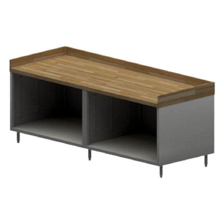 BK Resources CMBT-3096 Chef Table Cabinet Base With Open Front 24"W x 30"D x 39"H Overall Size is a versatile and durable solution for professional kitchens and food service environments. This chef table boasts a 1-3/4" thick hard maple baker's top, complemented by a 4" coved riser on the back and sides, providing a reliable surface for culinary tasks. The table's body is constructed from 18/304 stainless steel, known for its strength and corrosion resistance, making it ideal for demanding kitchen settings. The cabinet base features an open front design with a center mullion, while the sides and rear are enclosed with stainless steel panels, ensuring stability and a sleek appearance. Standing on 6” stainless steel legs, the structure offers a 1" height adjustment, allowing customization to fit various kitchen layouts. The stainless steel feet contribute to the table's overall sturdiness and resilience. Certified by NSF, the BK Resources CMBT-3096 guarantees compliance with health and safety standards, making it a reliable choice for chefs and kitchen professionals. Its blend of high-quality materials and functional design elements makes this chef table a valuable addition to commercial kitchen operations.