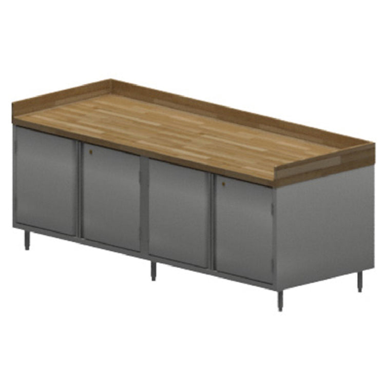 The BK Resources CMBT-3096HL Chef Table Cabinet Base With Hinged Doors & Locks 96"W X 30"D X 39"H Overall Size is a highly functional and durable piece designed for professional kitchen environments. This chef table features a 1-3/4" thick hard maple baker's top, providing a sturdy and reliable surface for food preparation. It includes a 4" coved riser on the back and sides, adding an extra layer of containment for any spills or ingredients, thus preserving cleanliness and efficiency in the kitchen. The body is constructed from 18/304 stainless steel, offering excellent resistance to corrosion and ensuring longevity, even under heavy use. For secured storage, the unit is equipped with two sets of hinged doors, each with locks, providing a safe environment for your culinary tools and ingredients. A center mullion adds structural integrity, while the six stainless steel legs, with a 1" height adjustment feature, provide stability and allow for leveling on uneven surfaces. With stainless steel feet adding to the overall durability, this NSF-certified chef table is built to meet stringent health and safety standards, making it suitable for diverse culinary applications across different market segments including restaurants, catering services, and institutional kitchens.