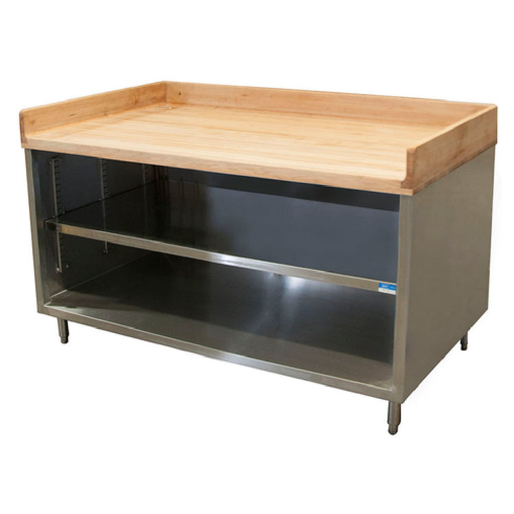 The BK Resources CMBT-3648 Chef Table Cabinet Base With Open Front stands as a meticulously engineered piece of kitchen equipment, measuring 48 inches in width, 36 inches in depth, and 39 inches in height. At its core, this chef table features a 1-3/4 inch thick Hard Maple Bakers Top, complemented by a 4-inch coved riser on the back and sides, providing a sturdy and reliable surface for culinary tasks. Its body is crafted from 18/304 stainless steel, ensuring durability and resistance to corrosion, making it suitable for high-demand environments. The cabinet base is enclosed with stainless steel panels on the sides and rear, creating a professional and seamless appearance. Designed for adaptability, the table is supported by 6-inch stainless steel legs with a 1-inch height adjustment capability, ensuring stability on various surfaces. Stainless steel feet contribute to its robust design, endorsing a long-lasting investment for commercial kitchens. Certified by NSF, this chef table meets high standards of public health protection, making it an exemplary choice for restaurants, bakeries, and catering services that require a combination of durability, functionality, and compliance within their workspace equipment.