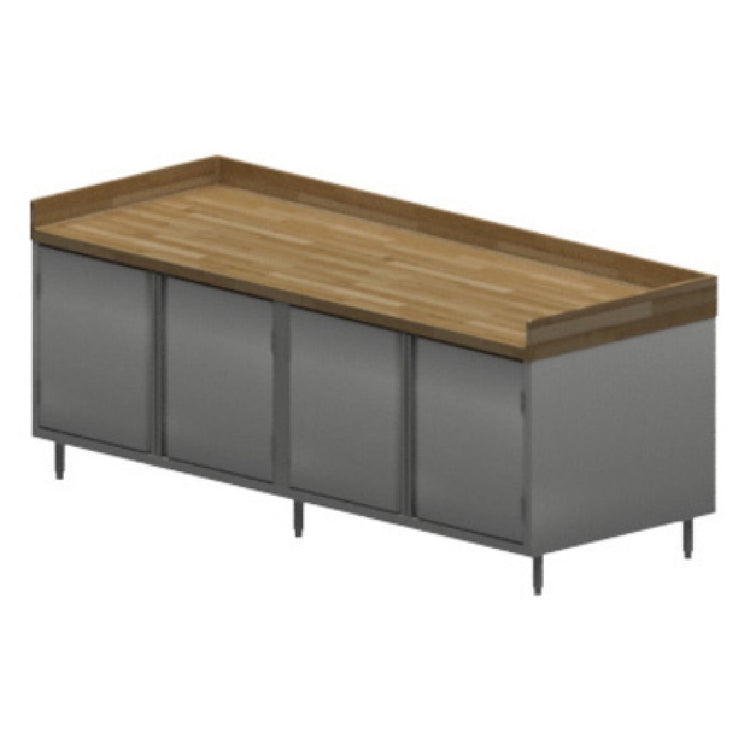 The BK Resources CMBT-3696H Chef Table Cabinet Base With Hinged Doors is a meticulously designed piece, catering to the needs of professional kitchens. With an overall size of 96"W x 36"D x 39"H, this chef table is equipped with a 1-3/4" thick Hard Maple Bakers Top, ideal for heavy-duty food preparation. It features a 4" coved riser on the back and sides, ensuring ingredients stay contained within the working area. The body is constructed from 18/304 stainless steel, a material known for its durability and ease of cleaning. The table includes a center mullion and two sets of hinged doors, offering practical storage solutions with stainless steel panels enclosing both the sides and the rear. For stability, it stands on 6” stainless steel legs with a 1" height adjustment feature, complemented by stainless steel feet. This chef table is NSF certified, highlighting its adherence to public health and safety standards. Particularly suitable for high-volume culinary environments, the BK Resources CMBT-3696H provides a blend of functionality and robustness, making it an invaluable asset for chefs and culinary professionals who demand reliability and efficiency in their kitchen equipment.