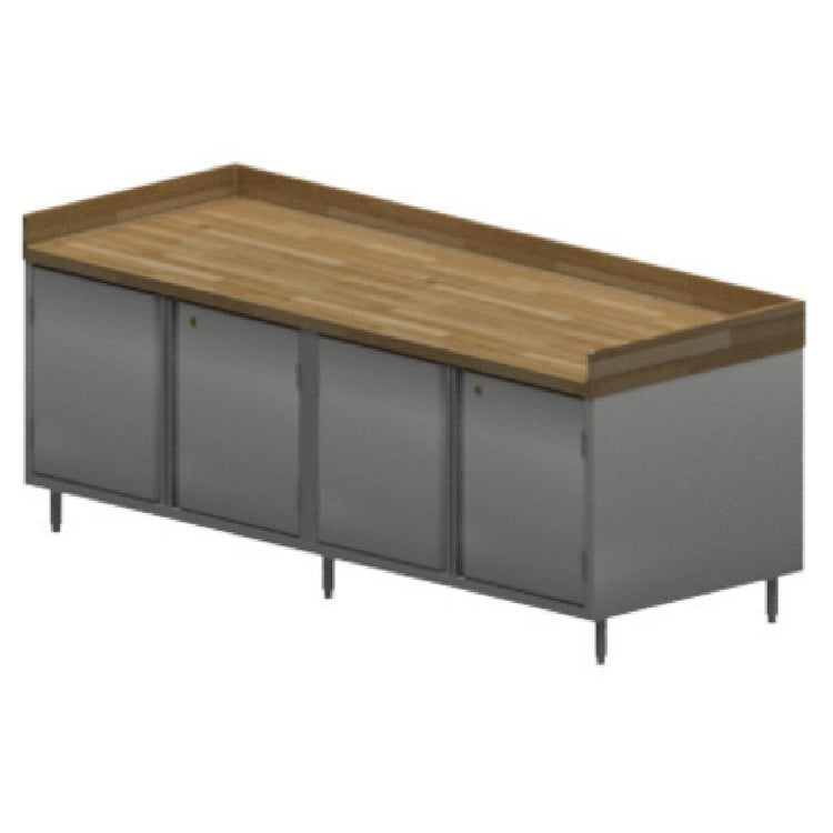 The BK Resources CMBT-3696HL Chef Table Cabinet Base With Hinged Doors & Locks is a meticulously designed unit, measuring 96"W x 36"D x 39"H overall. This chef table is topped with a 1-3/4" thick Hard Maple Bakers Top, featuring a 4" coved riser on the back and sides, providing both durability and functionality for culinary professionals. The table's body is crafted from 18/304 stainless steel, ensuring longevity and resistance to corrosion, suitable for demanding kitchen environments. It includes a center mullion and two sets of hinged doors equipped with locks, offering secure storage solutions. The enclosed design features stainless steel panels on the sides and rear, maintaining a sleek and hygienic appearance. Additionally, the table is supported by 6" stainless steel legs with a 1" height adjustment capability and stainless steel feet, providing stability and adaptability to various kitchen layouts. This product is NSF certified, indicating its compliance with public health standards, making it an excellent choice for restaurants, bakeries, and other food service establishments seeking a robust, secure, and versatile chef table solution. The BK Resources CMBT-3696HL is designed to meet the diverse needs of culinary professionals, combining quality craftsmanship with practical features.
