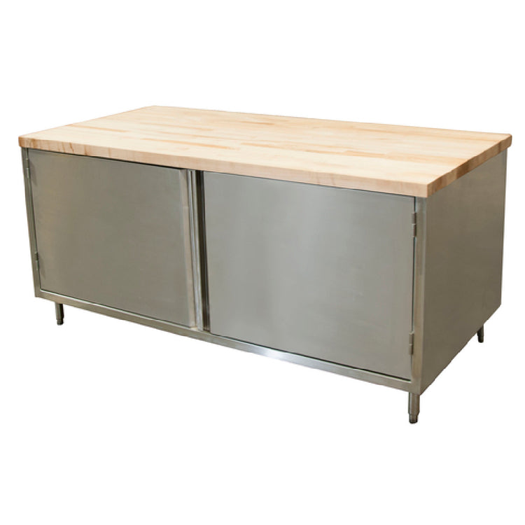 The BK Resources CMT-3072H Chef Table Cabinet Base With Hinged Doors is a versatile kitchen unit designed for efficiency and durability in professional culinary environments. Measuring 72"W x 30"D x 34-3/4"H overall, this chef table caters to various operational needs within different market segments, from large-scale commercial kitchens to artisanal food production spaces. The table features a 1-3/4" thick hard maple flat top, finished with penetrating oil to ensure longevity and a smooth work surface. The body is crafted from 18/304 stainless steel, known for its resilience and resistance to corrosion, making it ideal for rigorous kitchen use. Equipped with a set of hinged doors, the chef table provides convenient storage solutions and easy access to essential kitchen tools and ingredients. The 6” stainless steel legs include a 1" height adjustment, allowing for customization to fit specific kitchen ergonomics, while stainless steel feet contribute to its stability. The NSF certification confirms its compliance with rigorous health and safety standards, ensuring it meets the needs of a high-demand kitchen environment. With a lead time of 3-10 days, the BK Resources CMT-3072H Chef Table is a strategic addition to any professional kitchen setup, emphasizing durability and practicality.
