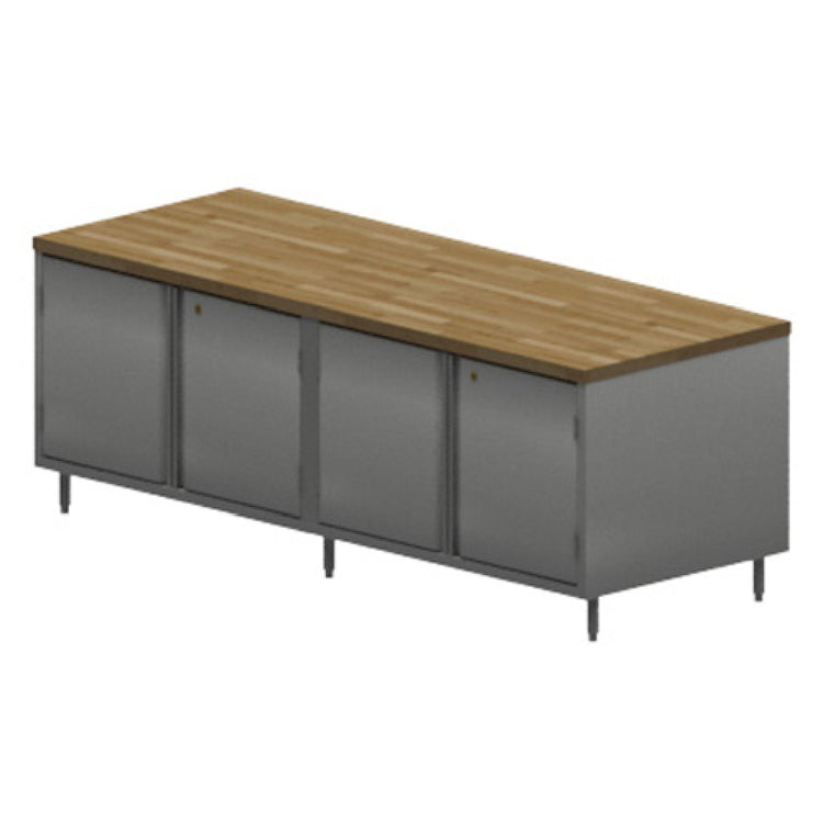 The BK Resources CMT-3096HL Chef Table Cabinet Base With Hinged Doors & Lock is a versatile addition to any professional kitchen environment. With an overall size of 96"W x 30"D x 34-3/4"H, this chef table provides ample workspace and storage capacity. Its 1-3/4" thick hard maple flat top, finished with penetrating oil, creates a durable and smooth surface ideal for food preparation. The 18/304 stainless steel body ensures long-lasting durability and resistance to corrosion, making it a reliable choice for high-demand settings. Equipped with two sets of hinged doors, each fitted with a lock, the CMT-3096HL provides secure storage for kitchen essentials, enhancing organization and accessibility. The 6" stainless steel legs accommodate a 1" height adjustment, allowing for customization to fit specific operational needs, while stainless steel feet add stability. The inclusion of NSF certification underscores its adherence to public health standards, making it suitable for a wide range of culinary applications. Designed to meet the demands of various market segments, from bustling commercial kitchens to educational culinary settings, this chef table combines functionality, security, and durability in one comprehensive unit, with a lead time of 3-10 days for delivery.