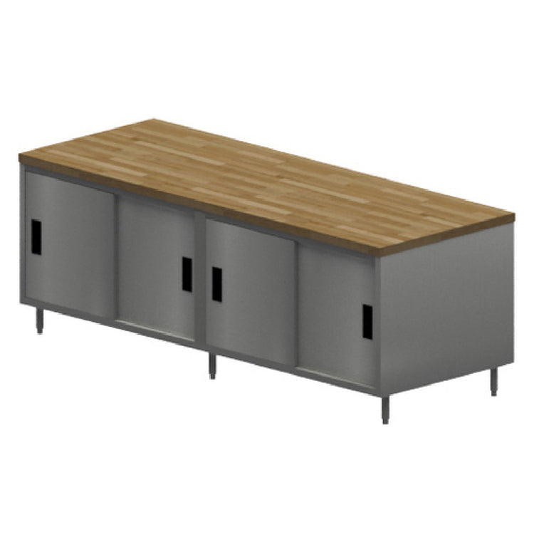 The BK Resources CMT-3096S2 Dual Access Chef Table is a high-performance kitchen workstation, designed to maximize efficiency and accessibility in demanding culinary environments. This table features a cabinet base with sliding doors on both sides, enabling seamless access and storage from either direction. With an overall size of 96 inches wide, 30 inches deep, and 34-3/4 inches high, it offers a substantial workspace while fitting comfortably in various kitchen layouts. The table's top is crafted from 1-3/4 inch thick hard maple, finished with penetrating oil to enhance durability and maintain a sleek appearance. The table's body is constructed from 18/304 stainless steel, ensuring robust strength and resistance against corrosion. A center mullion divides the storage space, while the two sets of sliding doors on each side provide versatile access. Its 6-inch stainless steel legs are adjustable up to 1 inch in height, allowing for customization according to kitchen needs, and are supported by stainless steel feet for enhanced stability. Certified by NSF, this chef table aligns with high standards of safety and hygiene. Ideal for professional kitchens, the BK Resources CMT-3096S2 chef table offers a blend of functionality, durability, and accessibility tailored for diverse culinary applications.