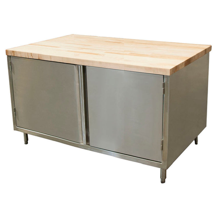 The BK Resources CMT-3648H Chef Table Cabinet Base With Hinged Doors is a meticulously designed piece tailored for professional kitchens requiring durable and functional prep surfaces. Its overall dimensions are 48 inches wide, 36 inches deep, and 34-3/4 inches high, offering ample workspace. The table features a 1-3/4 inch thick hard maple flat top, finished with penetrating oil for added resilience, making it suitable for heavy-duty food preparation tasks. The body is constructed from high-quality 18/304 stainless steel, ensuring long-term durability and easy maintenance. This chef table is equipped with a practical set of hinged doors that offer convenient storage, and 6-inch stainless steel legs featuring a 1-inch height adjustment capability, providing adaptability for various kitchen settings. The stainless steel feet further enhance stability and durability. Certified by NSF, this table meets rigorous public health and safety standards, making it a reliable choice for chefs and kitchen professionals seeking a robust and versatile workspace. The BK Resources CMT-3648H exemplifies quality and practicality, catering to the diverse needs of culinary environments where efficiency and hygiene are paramount.
