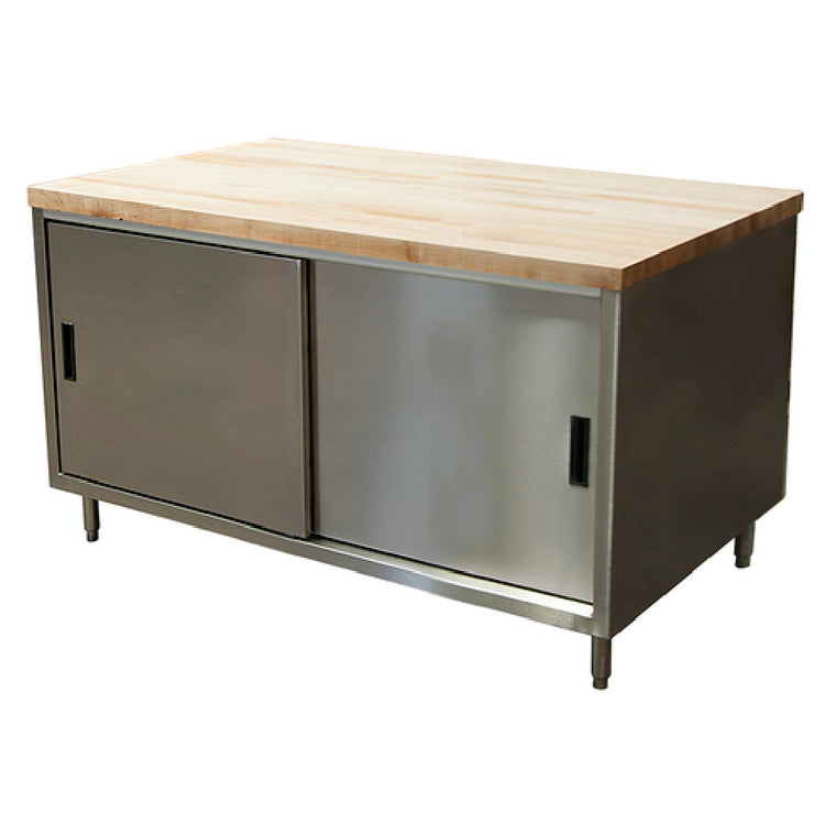 The BK Resources CMT-3648S Chef Table Cabinet Base With Sliding Doors is a meticulously engineered piece of kitchen equipment designed for professional culinary environments. With an overall size of 48"W x 36"D x 34-3/4"H, this chef table provides ample workspace and storage capabilities crucial for bustling kitchen operations. The table's top is crafted from 1-3/4" thick hard maple, finished with penetrating oil, offering durability and a smooth work surface. The body is constructed from 18/304 stainless steel, known for its resilience and corrosion resistance, making it ideal for the rigorous demands of commercial kitchens. The cabinet base features one set of sliding doors, allowing for easy access to stored items without taking up additional space, a significant advantage in compact kitchen layouts. The unit stands on 6" stainless steel legs with a 1" height adjustment, ensuring stability and adaptability to various kitchen setups. Stainless steel feet further enhance its sturdiness. The chef table is NSF certified, guaranteeing it meets public health and safety standards, making it a reliable choice for diverse market segments within the food service industry. This product is typically available with a lead time of 3-10 days, facilitating timely integration into kitchen operations.