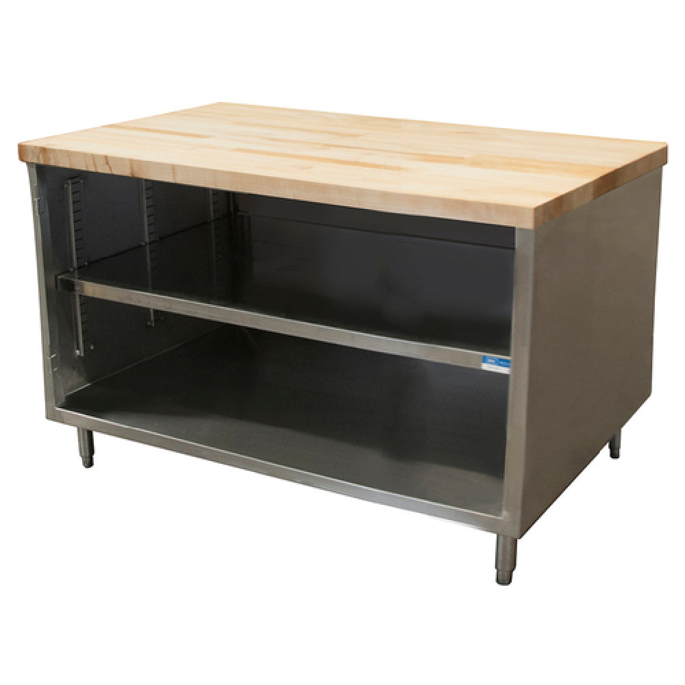 The BK Resources CMT-3660 Chef Table Cabinet Base with Open Front is a versatile and robust addition to any professional kitchen, featuring a spacious 60"W x 36"D x 34-3/4"H overall dimension. Its 1-3/4" thick hard maple flat top, finished with penetrating oil, provides a durable and smooth surface ideal for food preparation. The body is constructed from 18/304 stainless steel, offering exceptional durability and resistance to corrosion, while the enclosure with stainless steel panels on the sides and rear enhances its structural integrity and aesthetic appeal. Supported by sturdy 6” stainless steel legs, the table includes a 1" height adjustment feature and stainless steel feet, ensuring stability and adaptability to various kitchen environments. This chef table is NSF certified, signifying its compliance with strict public health standards, making it suitable for use in commercial kitchens. The open front design allows for easy access and storage, catering to the needs of chefs and kitchen staff who require efficiency and organization. The BK Resources CMT-3660 Chef Table is a perfect blend of functionality and durability, tailored for different segment markets within the food service industry, ensuring it meets the rigorous demands of high-volume culinary operations.