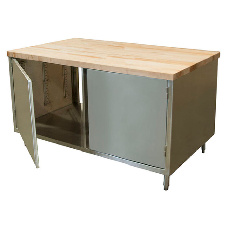 The BK Resources CMT-3660H2 Dual Access Chef Table Cabinet Base With Hinged Doors On Both Sides is a versatile and robust addition to any professional kitchen, offering practicality and ease of access. This chef table features an overall size of 60"W x 36"D x 34-3/4"H, providing ample workspace with its durable 1-3/4" thick hard maple flat top, finished with penetrating oil for enhanced durability and longevity. The body of the table is constructed from high-quality 18/304 stainless steel, ensuring both strength and corrosion resistance, making it ideal for demanding culinary environments. A unique aspect of this chef table is its dual access design, with a set of hinged doors on both sides, allowing for convenient access to stored items from either direction, thereby optimizing workflow efficiency. The table stands on 6" stainless steel legs, which include a 1" height adjustment feature to accommodate different ergonomic needs, and stainless steel feet for added stability. Additionally, this product is NSF certified, meeting rigorous public health and safety standards. With a lead time of 3-10 days, the BK Resources CMT-3660H2 chef table is well-suited for various segment markets within the food service industry that value reliability, accessibility, and premium construction.