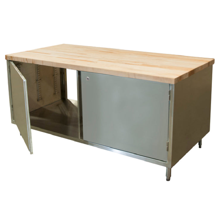 BK Resources CMT-3672HL2 Dual Access Chef Table Cabinet Base With Hinged Doors & Locks On Both Sides is a versatile and robust addition to any professional kitchen environment. This chef table is meticulously designed with a 72"W x 36"D x 34-3/4"H overall size, providing ample workspace for culinary activities. The table features a 1-3/4" thick hard maple flat top that is finished with penetrating oil, offering a durable and smooth surface ideal for food preparation. The 18/304 stainless steel body ensures longevity and resistance to corrosion, making it suitable for the demanding conditions of commercial kitchens. One of the standout features of this chef table is its dual access design, incorporating a set of hinged doors with locks on both sides, facilitating secure and easy access to stored items from either side of the unit. The table is supported by 6" stainless steel legs with a 1" height adjustment capability, allowing for customization to meet specific ergonomic requirements. Additionally, stainless steel feet provide stability and strength. This chef table is NSF certified, emphasizing its compliance with public health and safety standards. Ideal for various segments within the food service industry, this table offers a blend of functionality and durability.