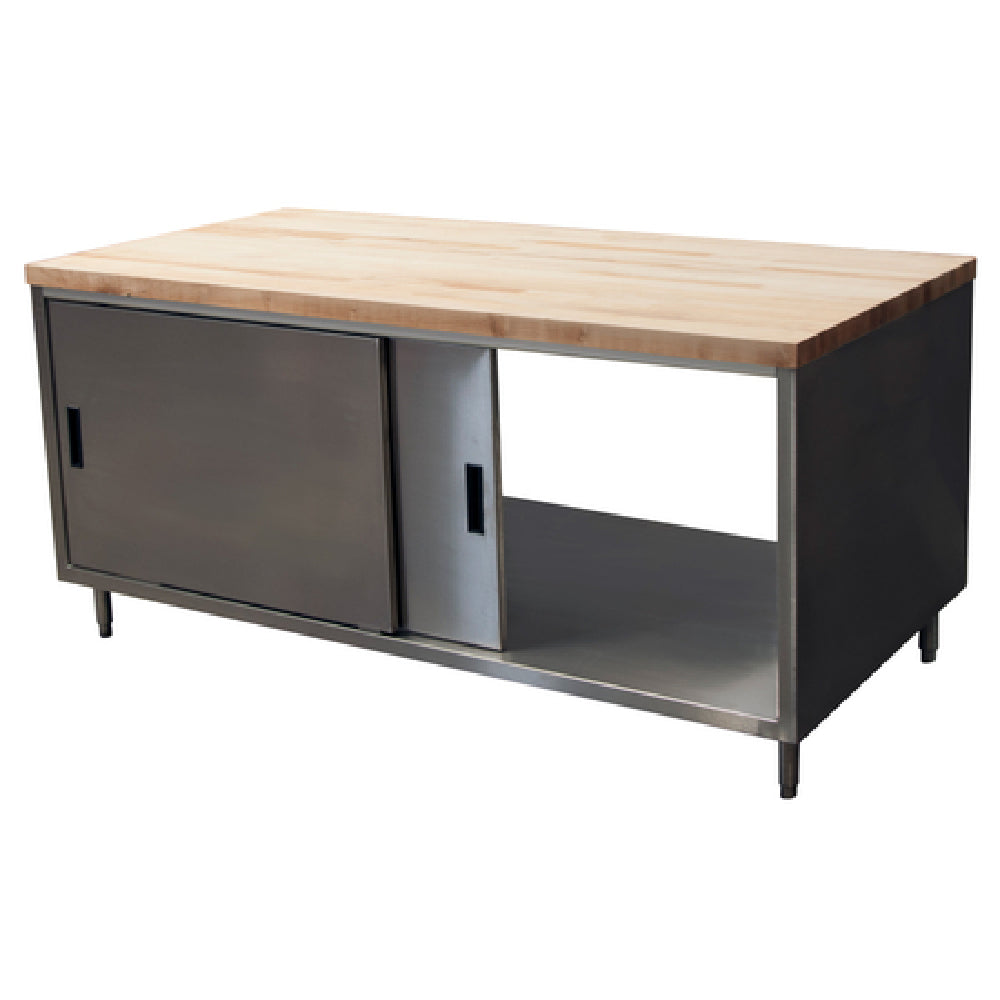 The BK Resources CMT-3672S2 Dual Access Chef Table Cabinet Base With Sliding Doors On Both Sides is a meticulously designed unit, ideal for culinary professionals seeking both efficiency and durability in their kitchen setup. With an overall size of 72 inches wide, 36 inches deep, and 34-3/4 inches high, this chef table provides ample workspace and storage. The standout feature is its 1-3/4 inch thick hard maple flat top, finished with penetrating oil, which offers a robust and smooth surface for food preparation. The table's body is constructed from 18/304 stainless steel, known for its exceptional resistance to corrosion, ensuring longevity and easy cleaning. Dual access is facilitated by a set of sliding doors on each side, allowing convenient entry from either direction, enhancing workflow efficiency in busy kitchen environments. The table stands on 6-inch stainless steel legs which include a 1-inch height adjustment feature, complemented by stainless steel feet for stability. Certified by NSF, this chef table meets high standards for public health protection, making it suitable for various food service applications. With a lead time of 3-10 days, this table is a strategic addition to professional kitchens, blending functionality with high-quality craftsmanship.