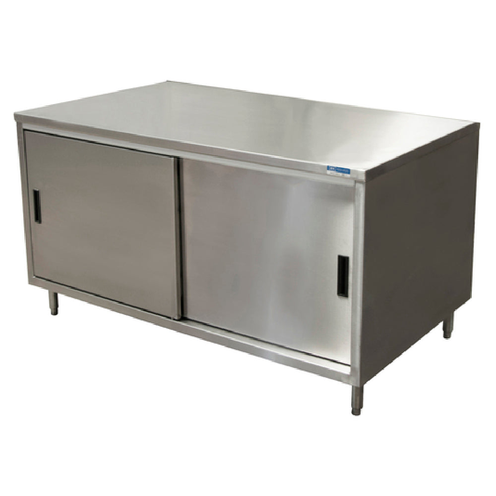 The BK Resources CST-3048S2 Dual Access Chef Table Cabinet Base With Sliding Doors On Both Sides is a meticulously designed piece of kitchen equipment that integrates functionality and durability for professional culinary environments. This chef table measures 48 inches in width, 30 inches in depth, and stands at a height of 34-3/4 inches, offering ample workspace. It features a 14-gauge, 304-grade stainless steel top, which is recognized for its superior corrosion resistance and robustness, ideal for heavy-duty kitchen tasks. The body is constructed from 18-gauge, 304-grade stainless steel, ensuring a sturdy and long-lasting structure. A unique aspect of this chef table is its dual-access design, incorporating a set of sliding doors on each side, facilitating easy access to stored items from multiple kitchen stations. The table stands on 6-inch stainless steel legs, equipped with a 1-inch height adjustment feature, complemented by stainless steel feet for enhanced stability. Certified by NSF, this chef table meets stringent public health and safety standards, making it a reliable choice for various food service operations. The BK Resources CST-3048S2 is crafted to support the efficiency and organization of culinary professionals, enhancing operational flow within diverse kitchen settings.