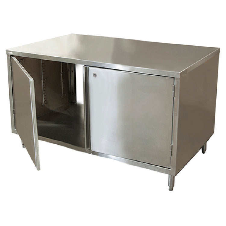 The BK Resources CST-3660HL2 Dual Access Chef Table Cabinet Base with Hinged Doors & Locks on Both Sides is meticulously engineered for professional kitchens requiring versatile and secure storage solutions. This chef table measures 60 inches in width, 36 inches in depth, and stands at a height of 34-3/4 inches, providing ample workspace and storage. Constructed with a 14-gauge 304 stainless steel top, it ensures robust durability and resistance to corrosion, making it suitable for high-demand culinary environments. The body, crafted from 18-gauge 304 stainless steel, complements the top with strength and longevity. A standout feature is its dual access design with a set of hinged doors equipped with locks on each side, offering convenient access and security across both sides of the table, making it ideal for bustling kitchen workflows. The table is supported by 6-inch stainless steel legs, which include a 1-inch height adjustment feature to cater to varying chef preferences and kitchen layouts. Stainless steel feet add stability and durability to the unit, further cementing its status as a reliable kitchen asset. NSF certification guarantees adherence to rigorous public health standards, ensuring safety and quality in commercial kitchen settings. The table’s lead time ranges from 3 to 10 days, accommodating urgent industry needs.