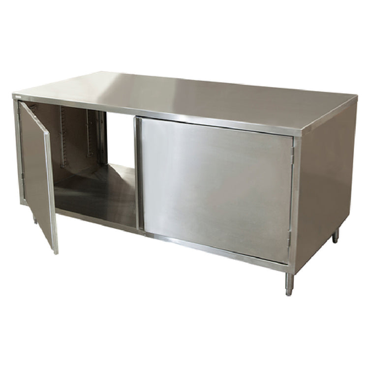 The BK Resources CST-3672H2 Dual Access Chef Table Cabinet Base With Hinged Doors On Both Sides is an innovatively designed piece of kitchen furniture, providing both functionality and durability. This chef table features a spacious 72-inch width, 36-inch depth, and stands at 34-3/4 inches high, making it an ideal choice for professional kitchens requiring substantial workspace. Its top is constructed from 14/304 stainless steel, a material known for its strength and resistance to corrosion, ensuring longevity even in demanding environments. The body of the table is made from 18/304 stainless steel, further enhancing its durability. A unique feature of this chef table is its dual access capability, thanks to hinged doors on both sides, allowing for efficient use of the cabinet space from different angles. The table is supported by 6-inch stainless steel legs, each equipped with a 1-inch height adjustment feature, and stainless steel feet, providing stability and adaptability to different floor conditions. Certified by NSF, this product meets rigorous health and safety standards, making it suitable for a wide range of culinary environments. The BK Resources CST-3672H2 Chef Table is an exemplary blend of utility and robust construction, catering to the needs of various segments within the food service industry.