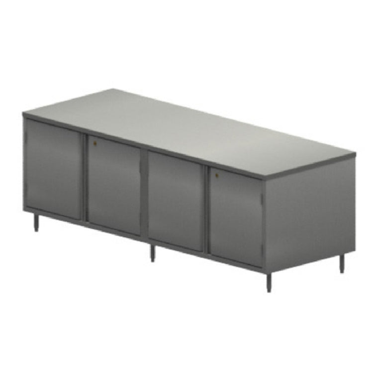 The BK Resources CST-3696HL Chef Table Cabinet Base With Hinged Doors & Locks is a precision-engineered product, tailored for culinary professionals and commercial kitchens requiring advanced storage solutions. The cabinet measures 96 inches in width, 36 inches in depth, and 34-3/4 inches in height, presenting a spacious and practical option for various kitchen environments. It features a 14-gauge 304 stainless steel top, renowned for its durability and resistance to corrosion, making it ideal for rigorous kitchen usage. Complementing the robust top, the body is constructed from 18-gauge 304 stainless steel, ensuring structural integrity and longevity. The design includes a center mullion, enhancing structural support and organization within the cabinet space. Two sets of hinged doors equipped with locks provide secure storage, and the stainless steel construction further ensures high resistance to wear and tear. The cabinet stands on 6-inch stainless steel legs with an adjustable height of 1 inch, offering adaptability to different height requirements. Additionally, the stainless steel feet guarantee stability. This chef table cabinet is NSF certified, ensuring compliance with public health standards, essential for professional kitchen environments. Its thoughtful construction and advanced features make it an invaluable fixture in the food service industry, catering to the needs of chefs and kitchen operators.